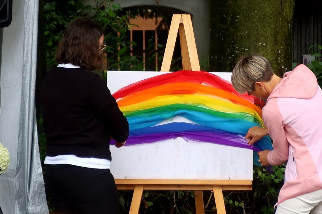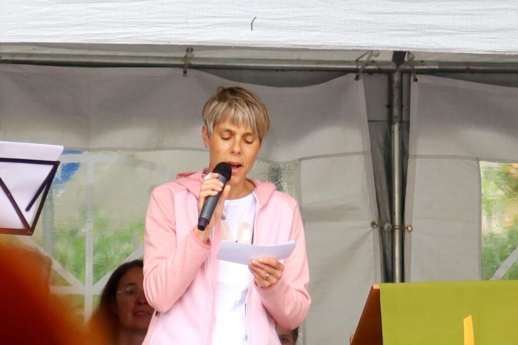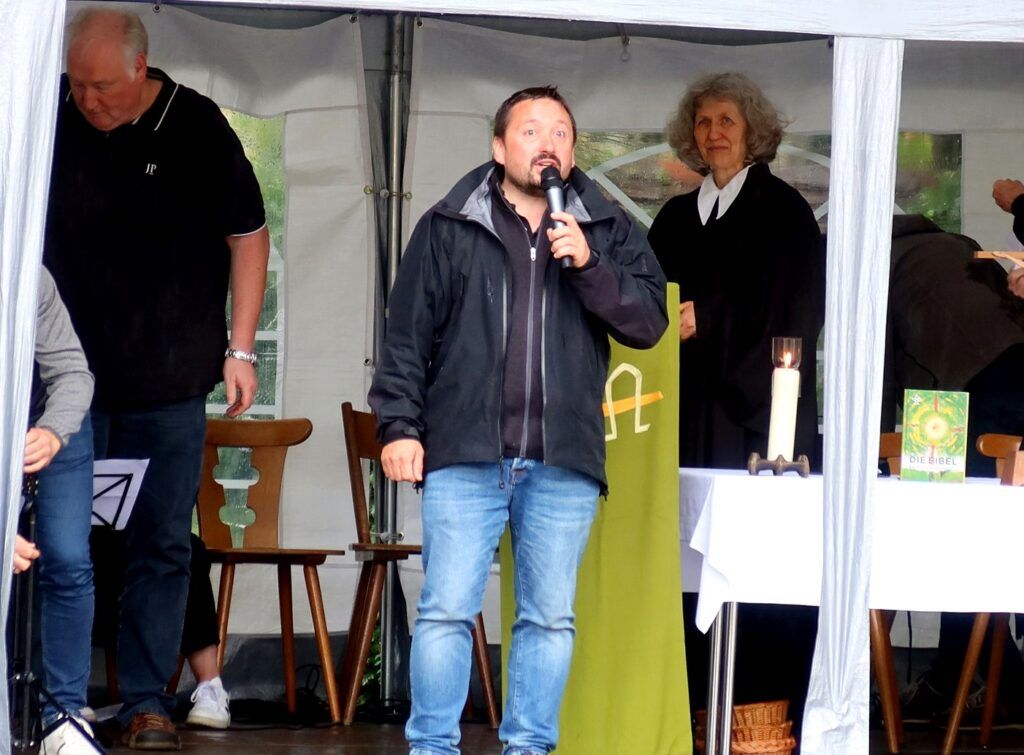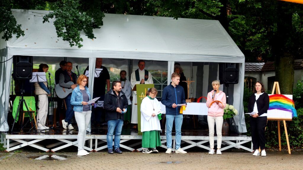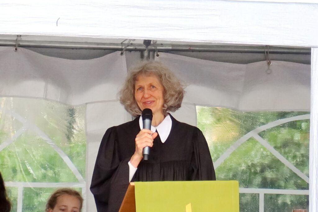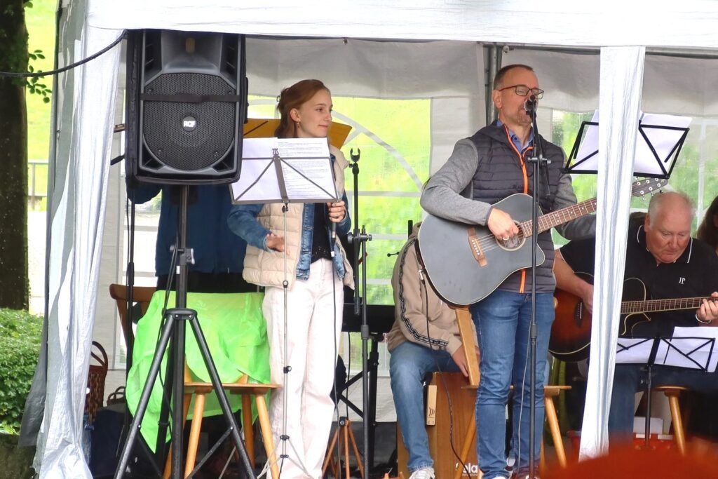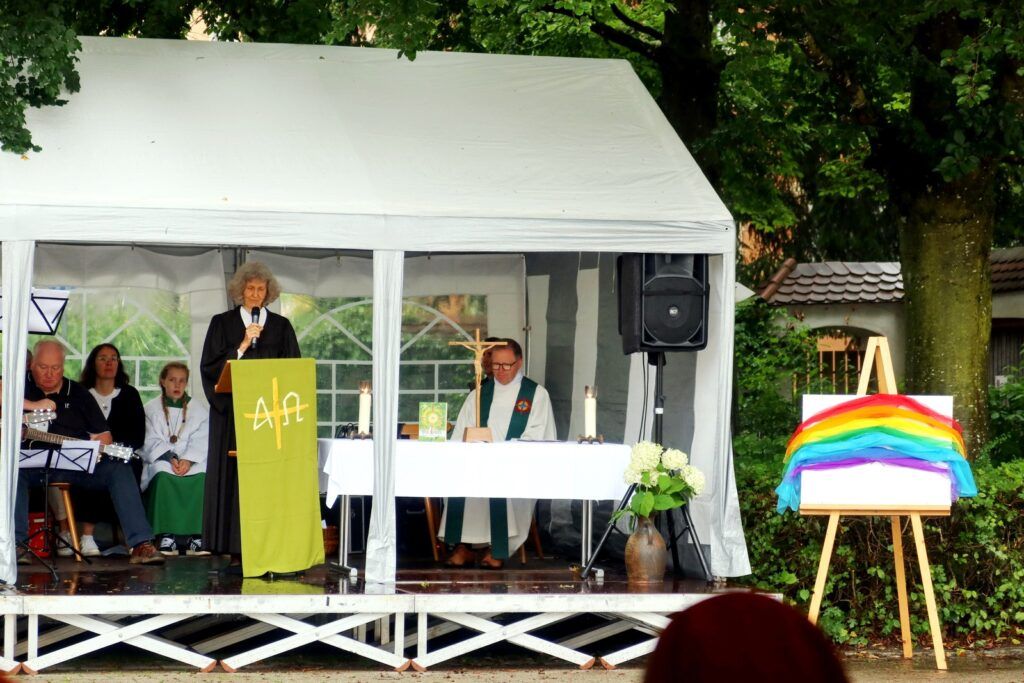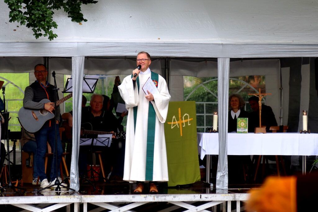 Noch etwas spärlich besetzt waren am Sonntagmorgen die Bänke in den Zelten beim Ökumenischen Gottesdienst um 9.30 Uhr. Es regnete ununterbrochen. Pfarrerin Birgit Oehme von der Evangelischen Kirchengemeinde Bad Waldsee und Pfarrer Thomas Bucher von der Katholischen Seelsorgeeinheit Bad Waldsee vertieften in Predigt und Ansprachen sowie bei den Bittgebeten das prägende Thema des Familiengottesdienstes „Gott und Mensch“. Die Berührung von Himmel und Erde wurde durch die religiöse Deutung der Regenbogenfarben und des Regenbogens anschaulich dargestellt. Dankbaren Applaus gab es für die sehr feierliche Umrahmung mit Gesang und Musik durch die Familiengottesdienstband Schumacher. Gemeinsam erbaten Pfarrerin Oehme und Pfarrer Bucher den Segen für all die Gekommenen und die ganze Gemeinde.