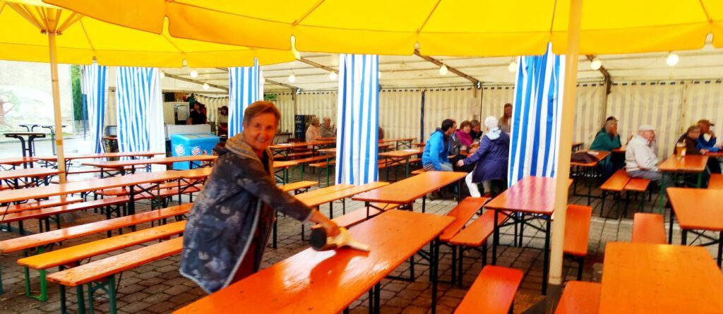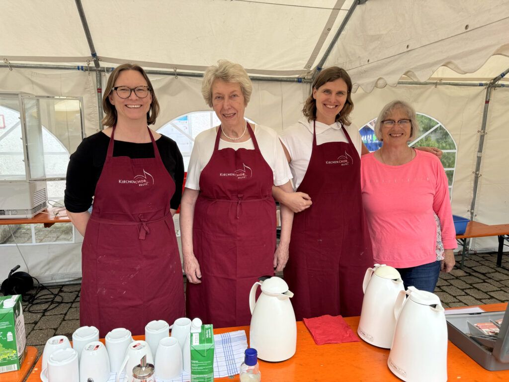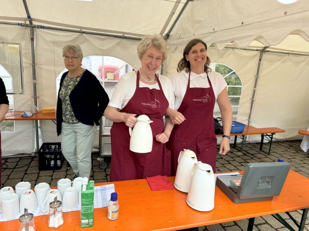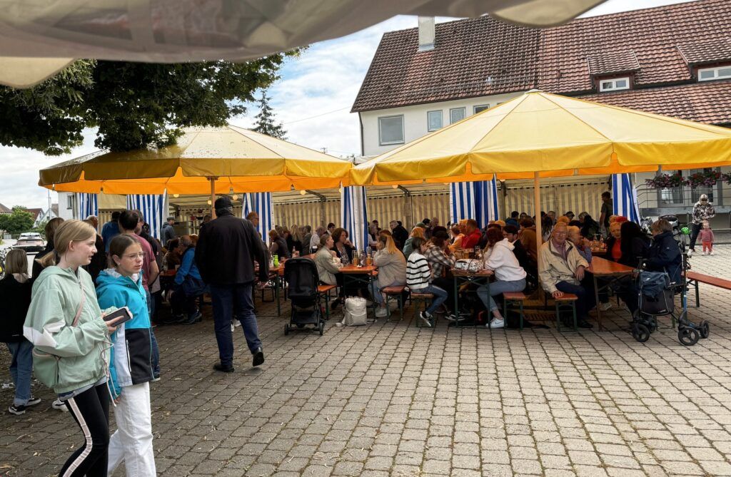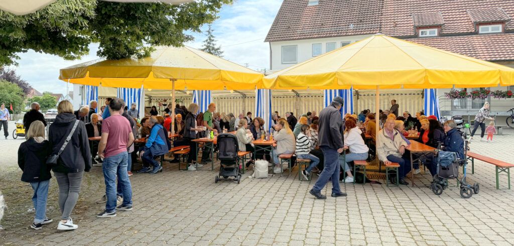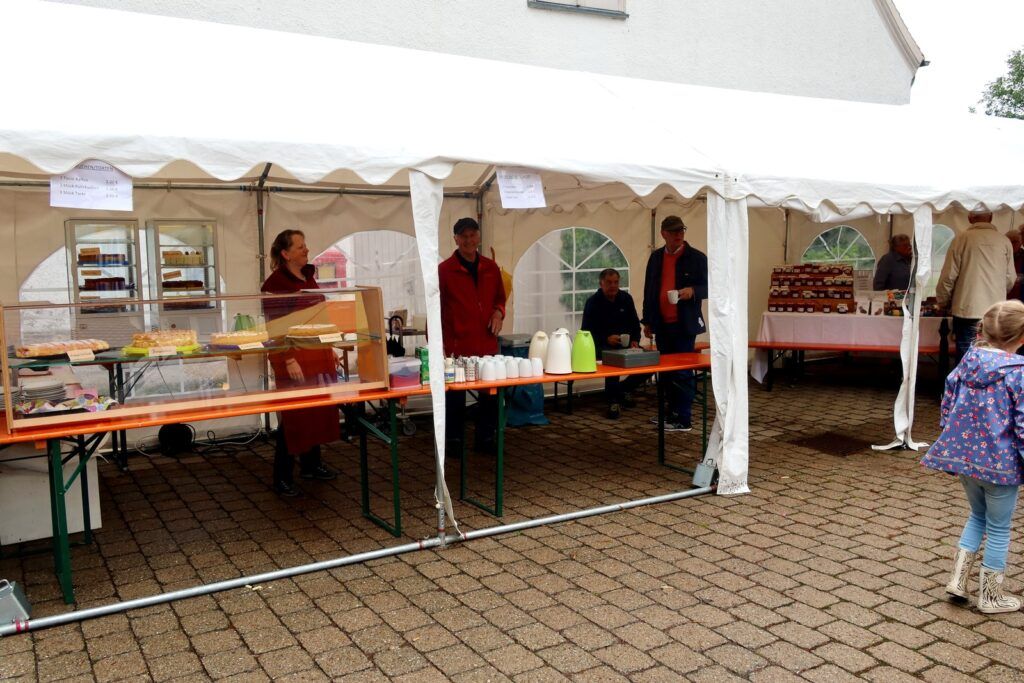 Zur Kaffeezeit herrschte im Zelt des Kirchenchors stets reger Betrieb, denn das Kaffee- und Kuchenangebot war umfassend und sehr gefragt. Im selben Zelt war ein Tisch mit Produkten des Strickkreises aufgebaut worden. Der Erlös dieser Verkaufsaktion (Handarbeiten, Geschenkutensilien, selbst gekochte Marmelade) ist bestimmt für die Missionsarbeit der Franziskanerinnen von Reute in Indonesien und Brasilien. Auch die Kollekte beim Familiengottesdienst ist für soziale Zwecke bestimmt und dient der hiesigen, so aktiven „Solidarischen Gemeinde“.