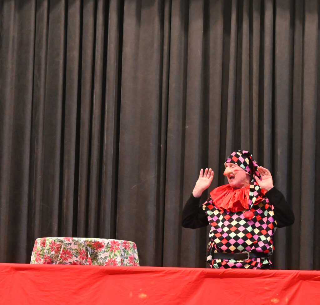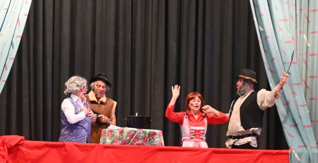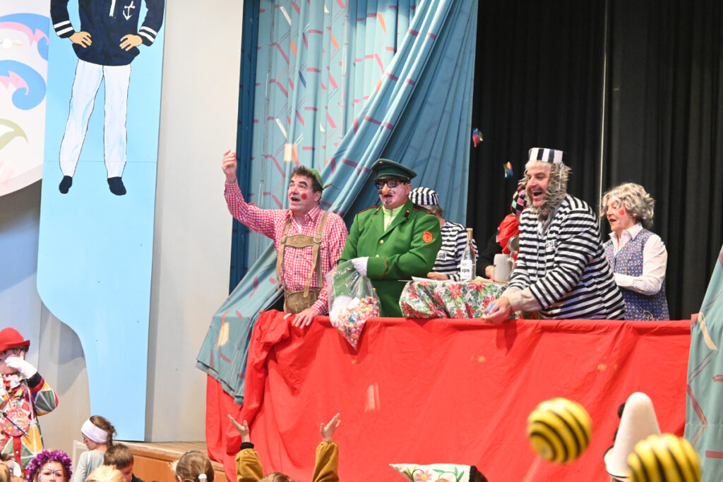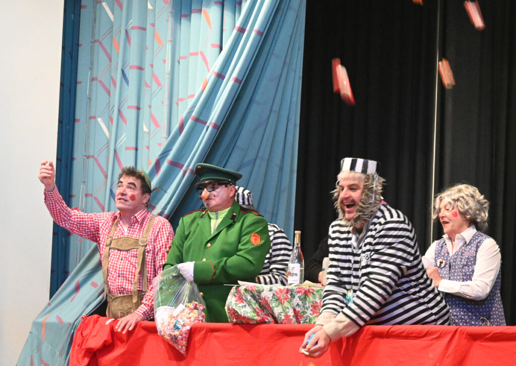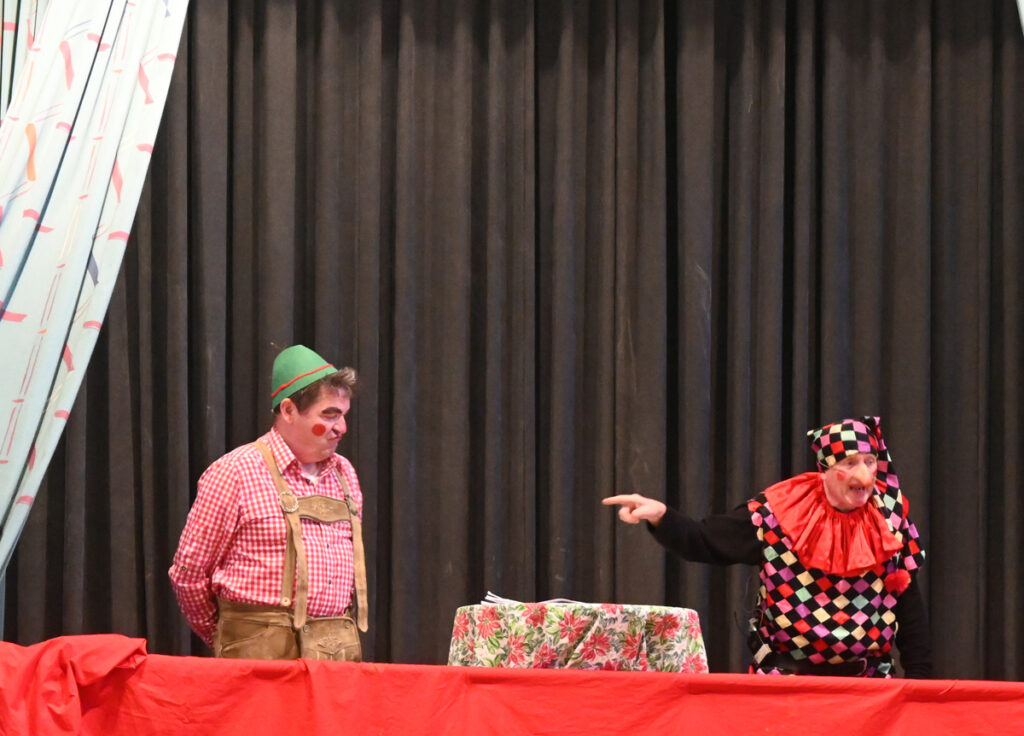 In der Pause wird die Bühne umgebaut. Und mit Tritratrallala spaziert der Kasper gleich herein. Das klassische Kasperlespiel zieht die Kinder heute wie zu Omas Zeiten in den Bann. „Seid ihr alle da?“ „Was, ich hör ja nix“ Die Kinder schreien aus Leibeskräften. Das Spiel geht los. Zwei Räuber überfallen Oma und Gretel und rauben den guten Eintopf. Mal hängen die Kinder gebannt an den Lippen der Darsteller, mal machen sie lautstark mit, wenn der tölpelhafte Polizist die Räuber nicht zu fassen bekommt. Gottseidank bringen Kasper und Seppl das Unheil wieder in Ordnung. Alles geht gut aus und von der Bühne fliegen händeweise Guetsle in die Halle und werden von den Kindern begierig aufgelesen.