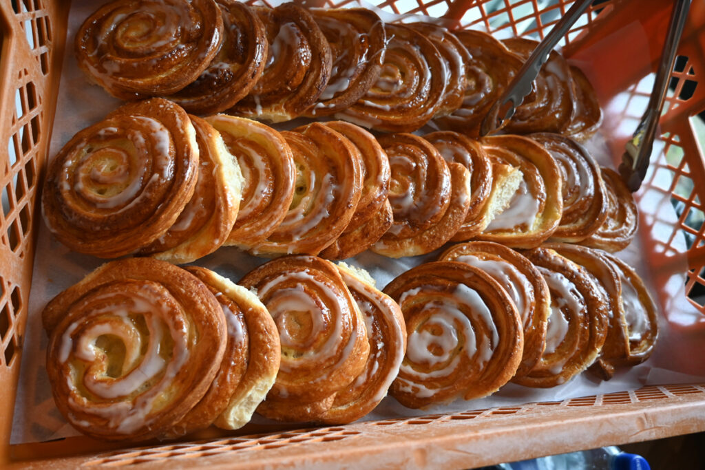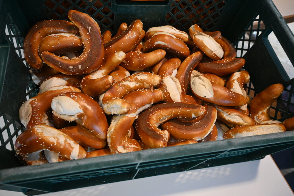 Die Sammler haben in der Halle zwei Stationen mit warmen Saiten, knusprigen Laugenhörnle und süßen Schnecken aufgebaut. Da greifen die Kinder gerne zu und lassen es sich schmecken.