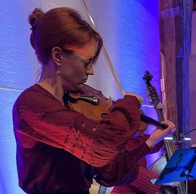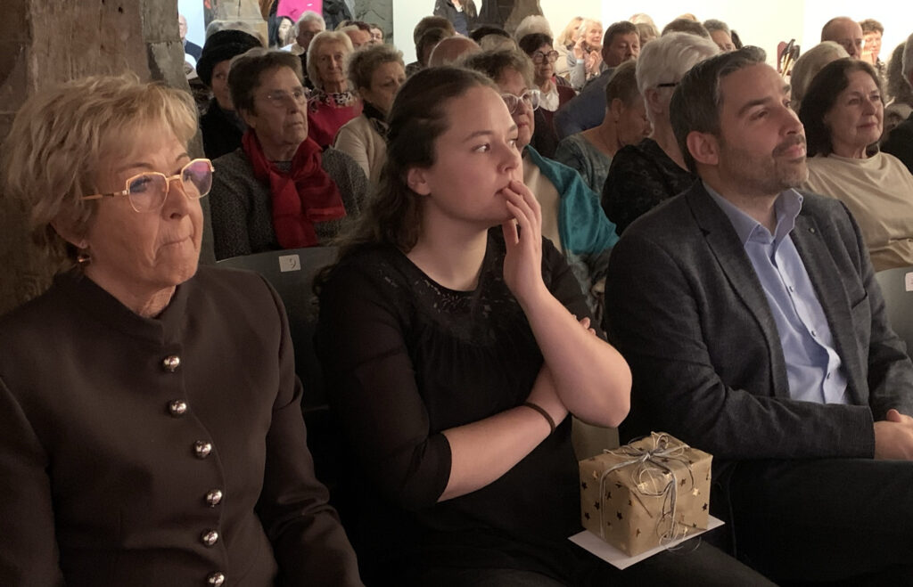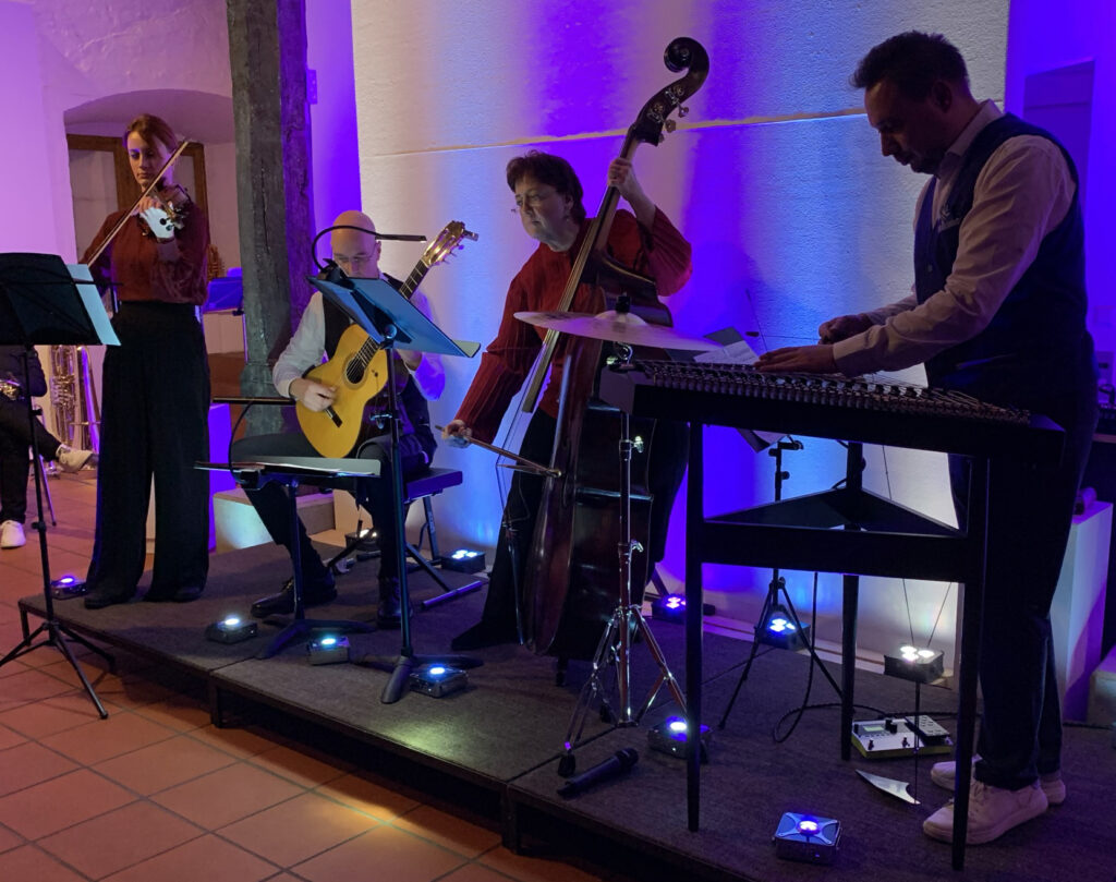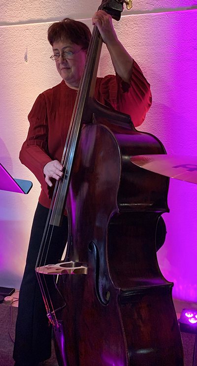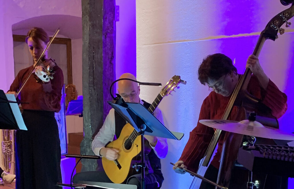 Die Bassistin Regina Hänsler gab – zum Aufwecken? – einen witzigen Schulaufsatz in schwäbischem Dialekt zum Besten. Er handelte vom alljährliche Aufbau der Weihnachtskrippe, diesmal mit Unterstützung des recht einfallsreichen Schulbuben. Weil es in der Stube doch so kalt war, wollte der mitfühlende Bub die Figuren am Ofen wärmen. Das allerdings bekam den dadurch verstümmelten Figuren nun gar nicht gut, weshalb kurzerhand improvisiert werden musste. So saß der Josef nun auf einem seitlich gestellten Playmobilmotorrad, damit das verlorene Bein nicht zu sehen war, das völlig geschmolzene Jesukind wurde durch den Asterix ersetzt, weil der genau in das Kinderbettle passte und warum konnte man nicht mehr existierende Weidetiere doch nicht auch durch Nilpferd oder Brontosaurus ersetzen? Die Geschenke der heiligen drei Könige waren denn auch Marlboro, Kaugummi, Pistole und Pizza statt Gold und Weihrauch. Bei diesem Anblick formulierte nun der Opa das lustige Kerzenadventsgedicht in Obstler um, etwa so: erst eins, dann zwei, dann drei, dann vier … mit den daraus resultierenden unvermeidlichen Folgen! Schon damit war das Publikum wieder auf heitere Weise hellwach geworden, ganz sicher aber durch das „Pure Imagination’ (Lesslie Bricusse) vom Saitenensemble. Hänsler beschrieb zuvor die Rollen der fünf eingesetzten Instrumente, die das Stück berührend interpretierten. Insbesondere Hackbrett und Violine waren dabei kraftvoll und tremoloartig zu genießen.