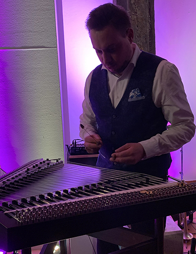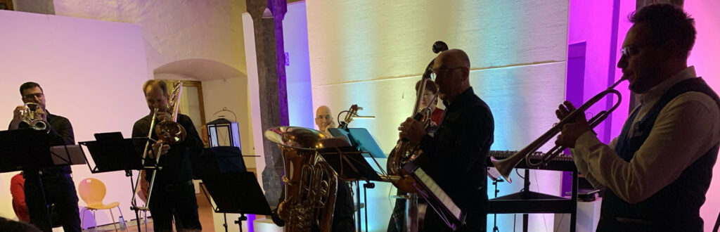 Beide folgenden Titel entführten das Publikum in den Swinging Jazz. „Sweet Georgia Brown“, intoniert von Salteris, brachten so manche Beine dem beliebten Song folgend in Bewegung. Ein perfektes Violinensolo bereicherte die Interpretation auf schönste Weise. Bei „Mr. Sandman“ (Pat Ballard) von Oberschwaben Brass war ein Einschlafen des Publikums absolut nicht zu befürchten. Alle fünf Blasinstrumente spielten darin eine jeweils für sie typische und deutliche Rolle. Offizieller Schluss des Konzerts war ein barocker Ausflug in französische Königsschlösser. „Fontaine et Rondeau“ (François Couperin). Das damals typische Rondo wurde am Hackbrett einfühlsam deutlich. Getragene und heitere Motive waren geboten, was die weite Dynamik der Salteris bewies.