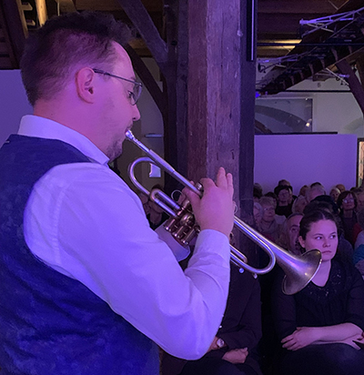 „Oberschwaben Brass“ mit Steffen Ocker (Trompete und Moderation), Severin Hänsler (Trompete), Hermann Stehle (Waldhorn), Matthias Dorner (Posaune) und Markus Rist (Tuba) nahm mit „Nivalúme’“, arrangiert von Severin Hänsler, die winterliche Stimmung elegant auf. Das teilweise getragen gespielte Stück erinnerte deutlich an winterliche Helligkeit und weiße Schneelandschaft. Auch mit Gustav Holsts „In the bleak midwinter“ malte Salteris ein romantisch-musikalisches Winterbild wohl aus der oberschwäbischen Heimat mit all ihren landschaftlichen Schönheiten und alten Gotteshäusern. Regina Hänsler trug dazu passend das Gedicht „Winternacht“ von Edeltrud Wisser vor, in dem ein glanzversiegeltes Wasserbett – gemeint ist damit ein zugefrorener See – das Sternenzelt wiederspiegelt. Das aus Finnland stammende „Sinun Silmäsi“ passte wunderbar zu diesem Bild und wurde einfühlsam von Salteris intoniert. Das Stück beschreibt Augen der Menschen in einsamen klirrend kalten nordischen Winterlandschaften, die diese Szenen aus einem warmen Haus durchs Fenster zufrieden wahrnehmen. Bei derzeit (6.12.) gerade mal acht Grad plus in Bad Waldsee seien die nordischen Minusgrade wohl nicht unmittelbar vorstellbar, aber musikalisch funktionierte das dennoch, meinte Hänsler. zurecht.