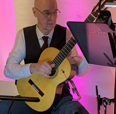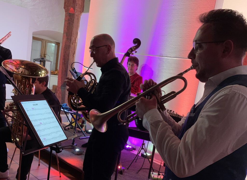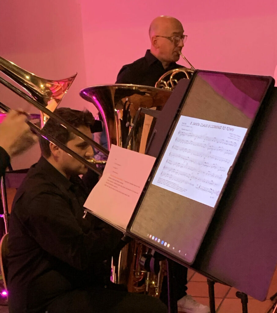 Steffen Ocker wollte zunächst den ankommenden Santa Clause samt Rentier (Fred J. Cools) nach Oberschwaben lenken, was natürlich nicht so ernst gemeint war. Santa Clause schwebte wie gewohnt musikalisch flott begleitet von vier strahlend harmonisch klingenden Instrumenten und einer Sicherheit bietenden Tuba weiter im kalten Norden.