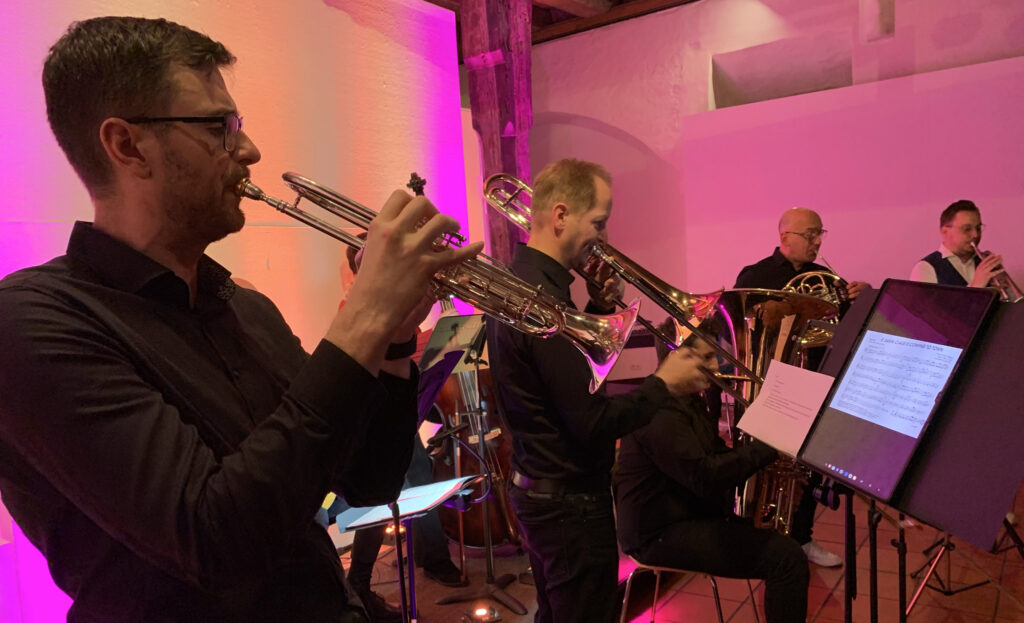 Bad Waldsee – Weihnachtlich leuchtete die historische Altstadt. Der Weihnachtsmarkt verbreitete duftende Vorfreude. Alte oberschwäbische Bräuche erwachten in Programmen und in den Herzen der Menschen. Allein der Winter hielt sich noch sehr bedeckt. Allerdings in der Pfeilerhalle hielt er musikalisch spürbar Einzug. Das Saitenensemble Salteris und Oberschwaben Brass erfüllten die Besucher reichlich mit adventlich-winterlichen Emotionen.