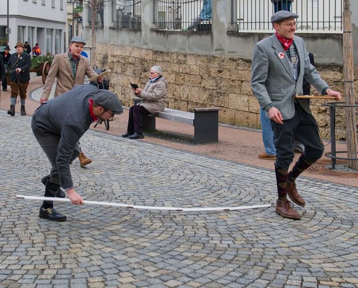 „Wer nix isch und wer nix ka, wird in Waldsee Zimmerma“, reimten die Geometer und stichelten in Richtung der Zimmermänner, die gelassen darüber hinweghörten und die Geometer darauf verwiesen, den Weg zu suchen. Das neckische Spiel zwischen den beiden Gruppen gehört traditionell zur Waldseer Fasnet dazu und amüsiert die Zuschauer am Wegesrand. Immer wieder inspizierten die Geometer die Wegstrecke ganz genau, bei Missfallen schrien sie, „das muss weg“, und kennzeichneten die Hindernisse mit Kreidestriche.