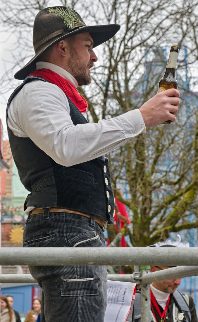 Amüsant waren die pointierten Reden. Mehrmals stoppten die Jungelfer, um die kleinen Geheimnisse der Waldseer aufzudecken. Unterhaltsam gab Thomas Walser auf dem Narrenbaum stehend die Pleiten-, Pech- und Pannenmomente wieder. Hier ein Beispiel: D Bibe macht seit Jahr und Tag beim Kessler allerhand elektrische Sachen, deshalb war´s ja nur klar, dass du musstest ein E-Bike leasen. Am sonnigen Wochenende fährt er an den Bodensee mit Frau und Rad. Die neuen Räder auf das Autodach geschnallt. Kurz vor dem See war dann so eine blede Unterführung im Weg. Doch hier hat das Augenmaß dann zum ersten Mal im Leben versagt, das Verkehrsschild und der Lenker verbogen. Wie Rumpelstilzchen bisch auf dem Autodach rumsprunga und das Blechschild wieder grad na gefaltet. Bibe, Waldsees bester Höhenschätzer! AHA