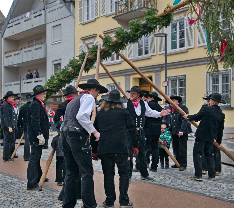 Auf der Hochstatt verfolgten rund 150 Interessierte das Narrenbaumstellen. Routiniert machten sich die Zimmerleute ans Werk, während die Geometer etliche Fasnetssprüche verkündeten. Bereitwillig stimmten die Zuschauer in die Rufe mit ein. Nach wenigen Minuten stand der Baum und so dankte Oberelfer Marc Schroedter allen Helfern.