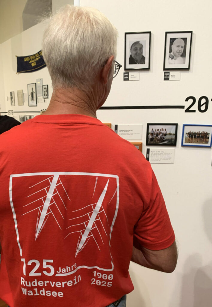 Ein Rudervereinsmitglied betrachtet eine der Ausstellungswände.