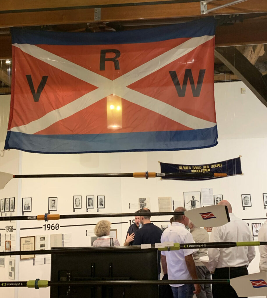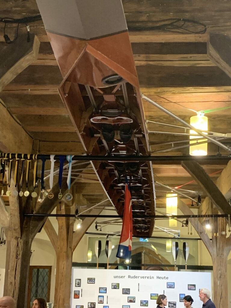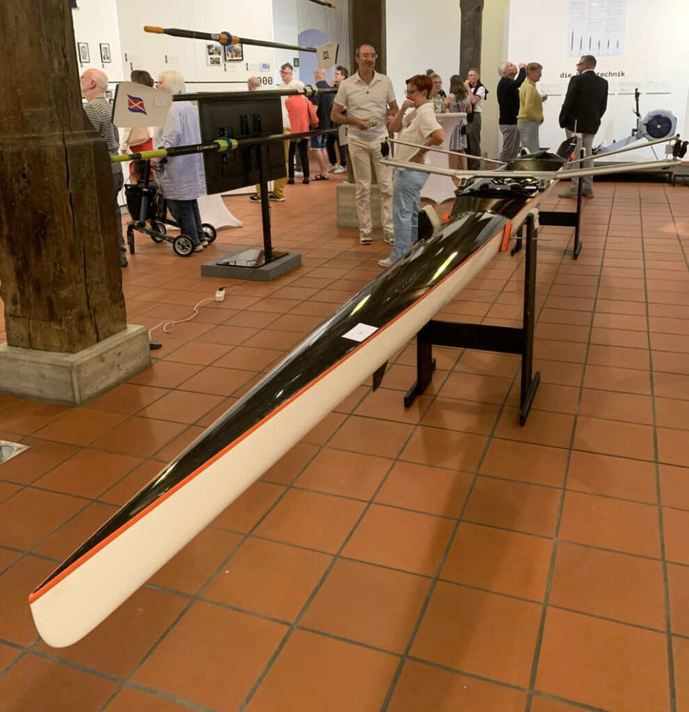 Niklas Wiest, zuständig für Kommunikation des Rudervereins, begrüßte die Gäste ebenfalls und berichtete über die intensiven Ausstellungsvorbereitungen zum 125. Jubiläum, die hauptsächlich von der Jugendabteilung des Vereins unter Leitung von Pascal Tschöke geleistet wurden. Er dankte auch dem Museumsverein für die gute Zusammenarbeit. Die Geschichte des Vereins wird in Form eines Zeitstrahls vom Gründungsjahr 1900 bis in die Jetztzeit mit Texten und Bildern gezeigt.