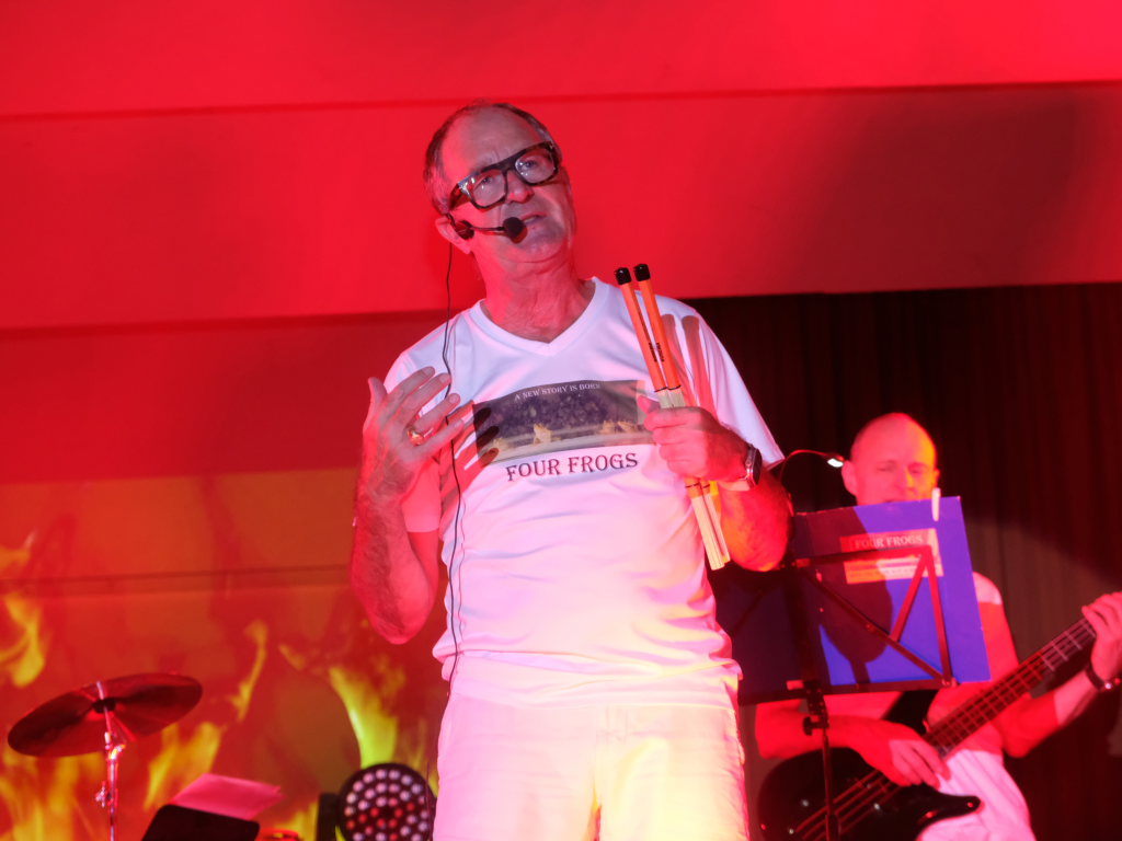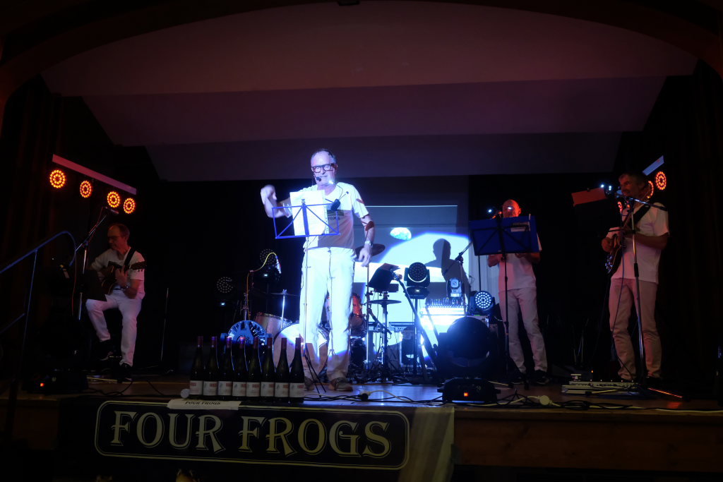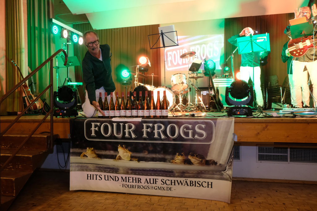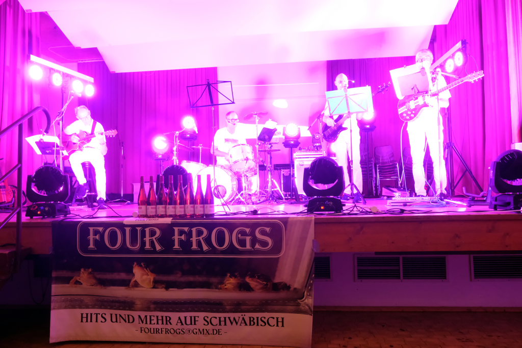 Die Band „Four Frogs“ versieht überwiegend englische Hits, aber auch deutsche Schlagermelodien und Ohrwürmer mit eigenen schwäbischen Texten. Die Band, das sind Manne Geggier, Giovanni Hepp, Wolfe Wirtensohn und Spiritus Rector Gebe Mayerhofer.
