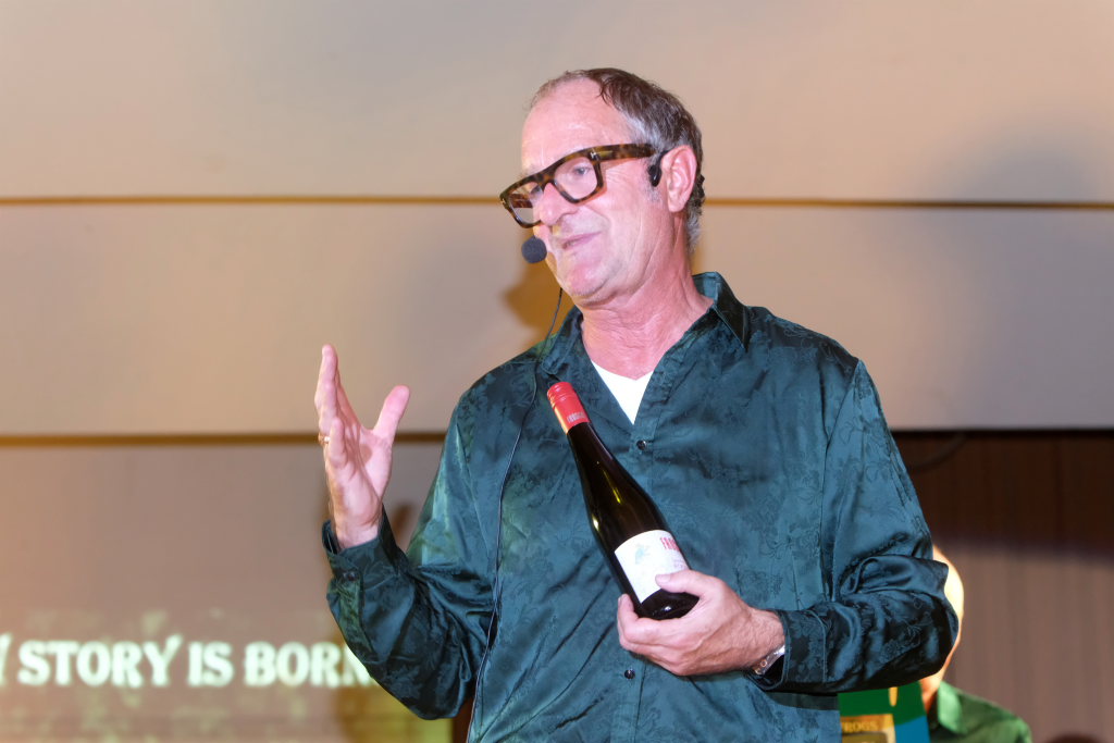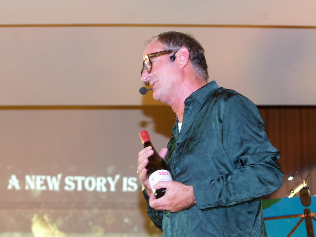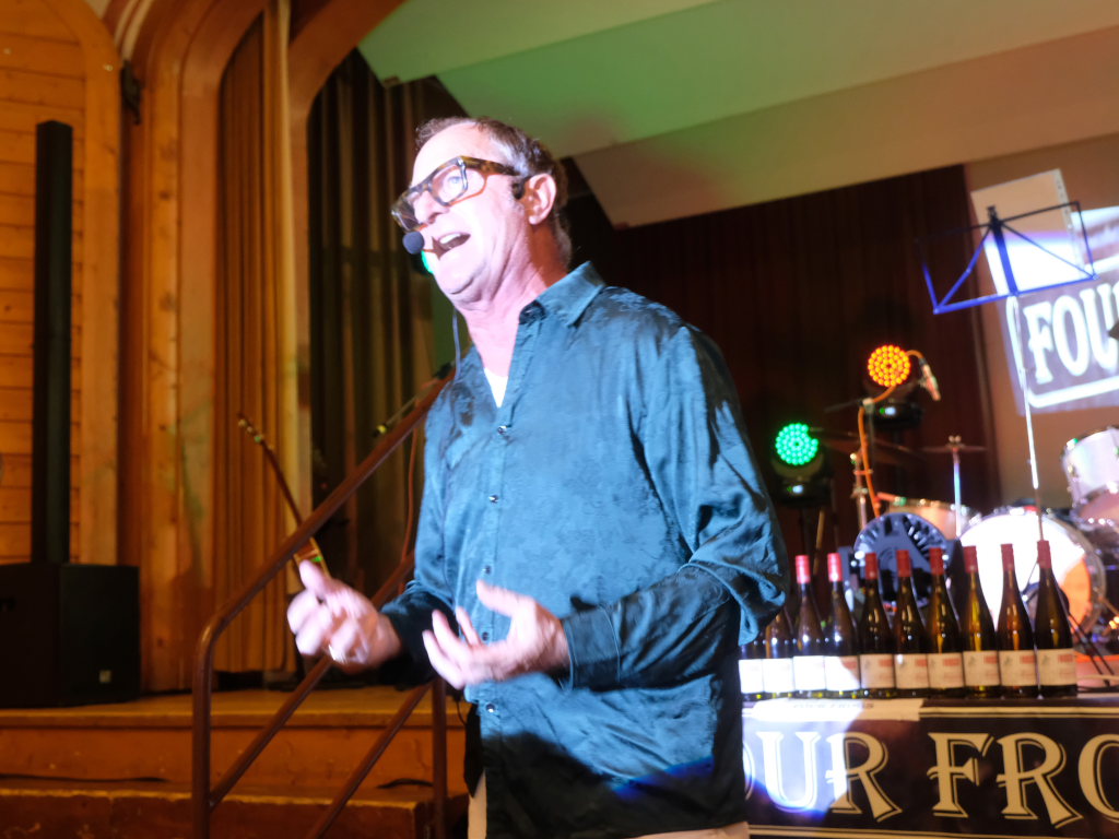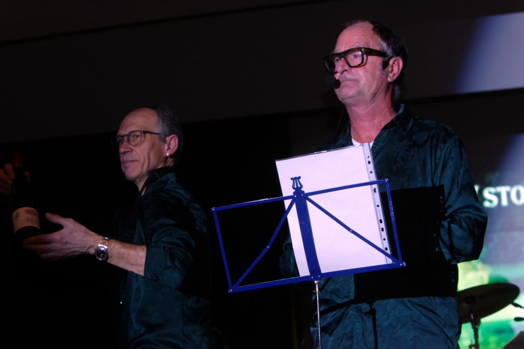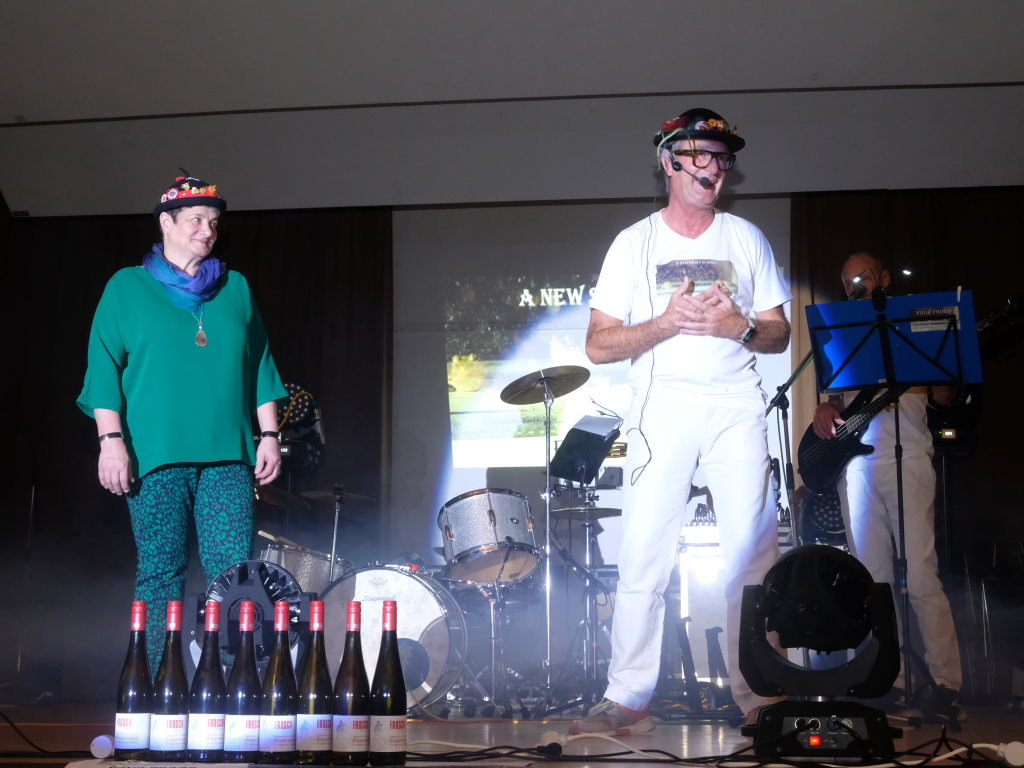 Und solche in Form von Weinflaschen standen dann auch am Bühnenrand, schön aufgereiht auch zum Verkauf. Und wie Mayerhofer dem staunenden Publikum verrät, haben die vier nämlich bei dem Weingut Frosch ihre eigenen Rebstöcke und diese Flaschen seien das Ergebnis ihrer ersten Ernte…