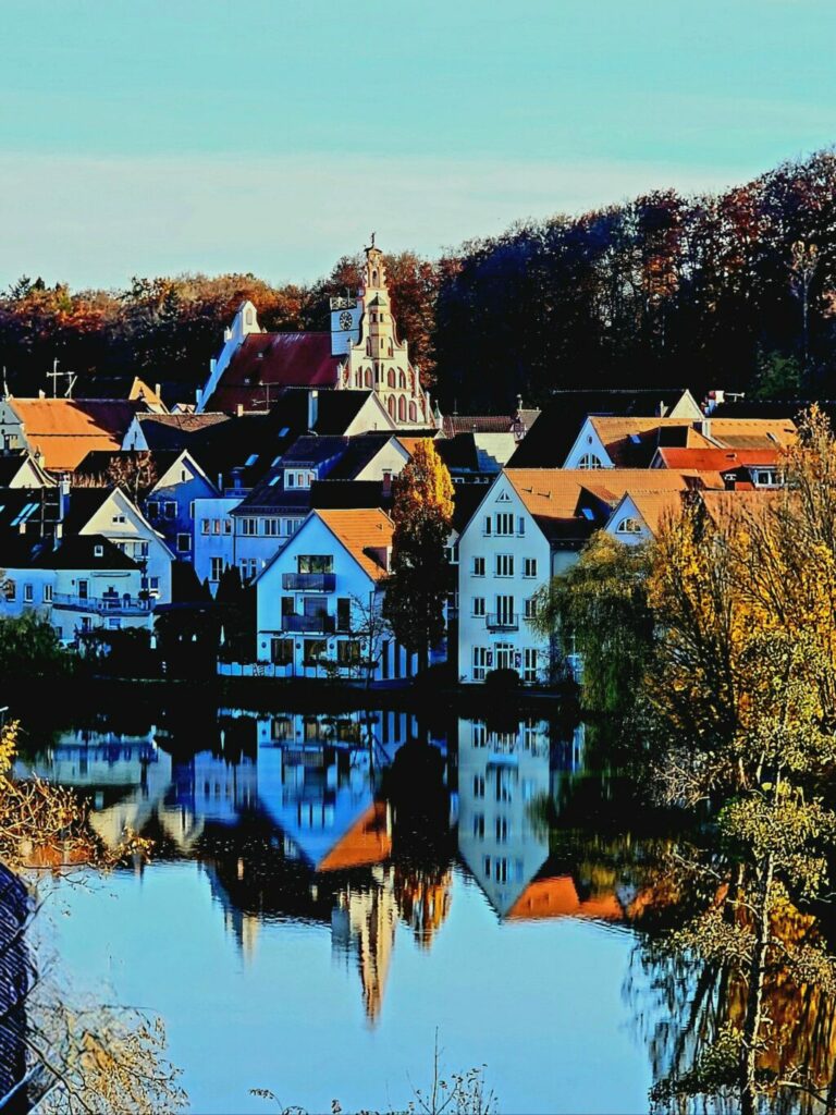 Bad Waldsee (rei) – Eva Zitzl aus Haisterkirch hat uns wieder zwei pittoreske Waldsee-Ansichten zukommen lassen. Am 30. Oktober hat sie eine Aufnahme vom Alten Rathaus, um das sich Altstadt-Häuser scharen, gemacht. Sie schreibt: „Der Giebel vom alten Rathaus überragt die ganzen Häuser, welche sich 1:1 im stillen Wasser des Sees widerspiegeln. Einfach wunderschön …“ Und eine Woche zuvor hat sie beim Spaziergang um den Stadtsee die Evangelische Kirche in den Fokus genommen. „Herbstlich eingerahmt von buntem Laub und unter dunklen Regenwolken ragt ihr spitzer Kirchturm in den Himmel“, schreibt sie dazu. Nachstehend die beiden Aufnahmen: