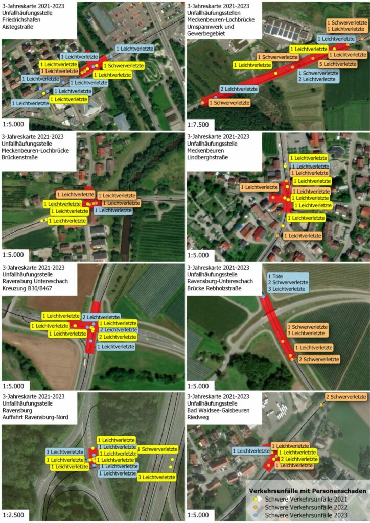 Auf den nicht zweibahnigen Streckenabschnitten von Ravensburg bis Friedrichshafen verunglückten sechs Menschen schwer und 53 leicht, zwei Menschen starben. Dies betraf vor allem die Ortsdurchfahrten Meckenbeuren mit Ortsteilen sowie Friedrichshafen. Tödlich verunglückten Menschen bei Meckenbeuren und Untereschach. Auf dem Streckenabschnitt nördlich von Baindt bis Biberach/Riß verunglückten acht Menschen schwer und 19 leicht, zwei Menschen starben. Die Unfallschwerpunkte lagen bei Enzisreute, Gaisbeuren und Unteressendorf. Tödlich verunglückten Menschen im Waldgebiet bei Enzisreute.