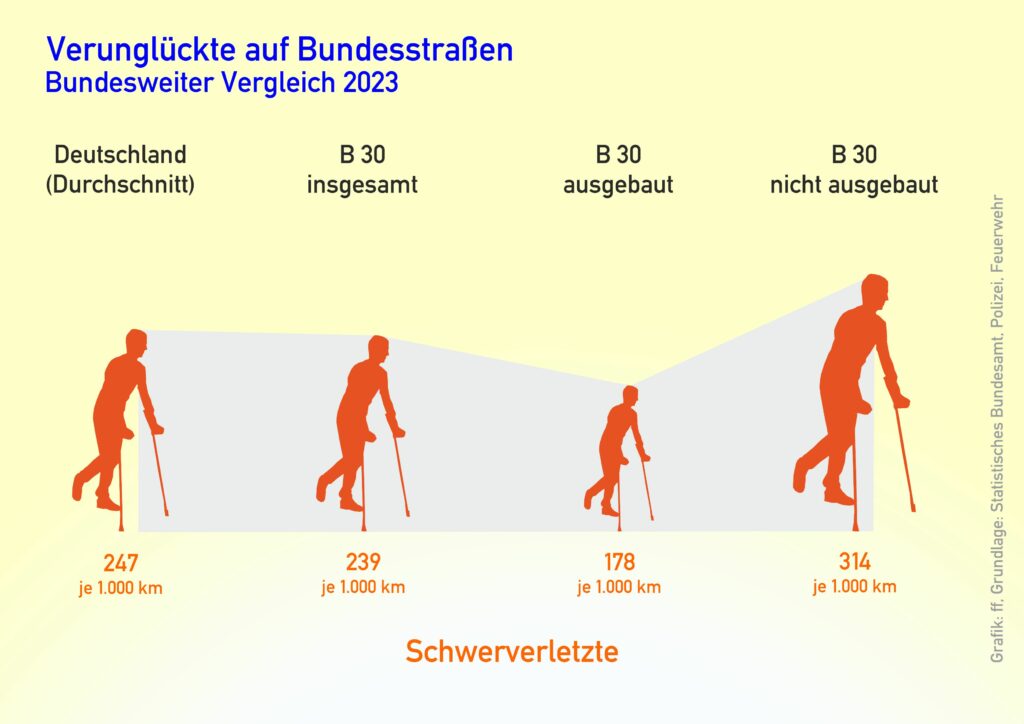 Auch im Jahr 2023 ereigneten sich auf den ausgebauten Streckenabschnitten der B 30 weniger schwerwiegende Unfälle als auf den nicht voll ausgebauten Streckenabschnitten: Mit einem Längenanteil von ca. 47 % ereigneten sich auf den nicht voll ausgebauten Streckenabschnitten rund 56 % aller schweren Verkehrsunfälle. 54 % der Verunglückten, 55 % der Leicht- und 58% der Schwerverletzten sowie alle Verkehrstote wurden im nicht voll ausgebauten Bereich gezählt.