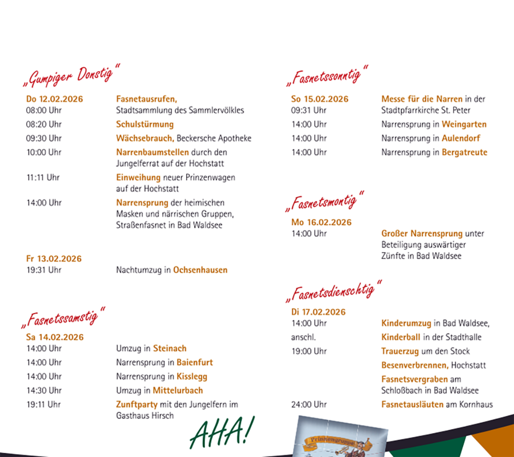 Bad Waldsee – Heute holen die Narren ihr Recht: Die Hochfasnet ist da! Mit ihrem Fasnets-Flyer gibt die Tourist-Information Bad Waldsee einen kompakten Überblick über die Waldseer Fasnet 2026. Ob traditionelle Veranstaltungen in Bad Waldsee oder Narrensprünge in der Umgebung – der Flyer bietet eine übersichtliche Orientierung durch die Fünfte Jahreszeit.