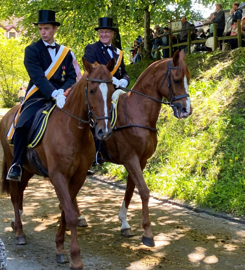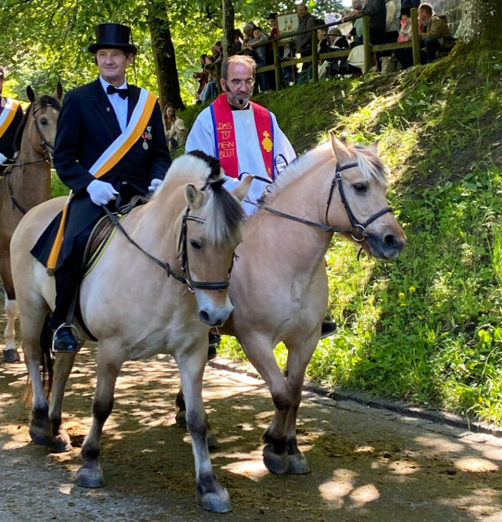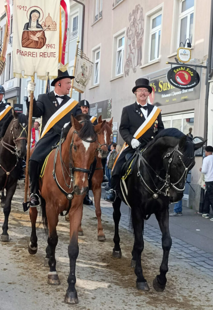 Die Blutreiter Gruppe Reute-Gaisbeuren nahm mit 14 Blutreiterinnen und Blutreitern am Blutritt teil. Pfarrer Stefan Werner begleitete Gruppe auf dem Pferd mit Gebeten, die die Lebenswirklichkeit der Menschen zum Ausdruck brachten.