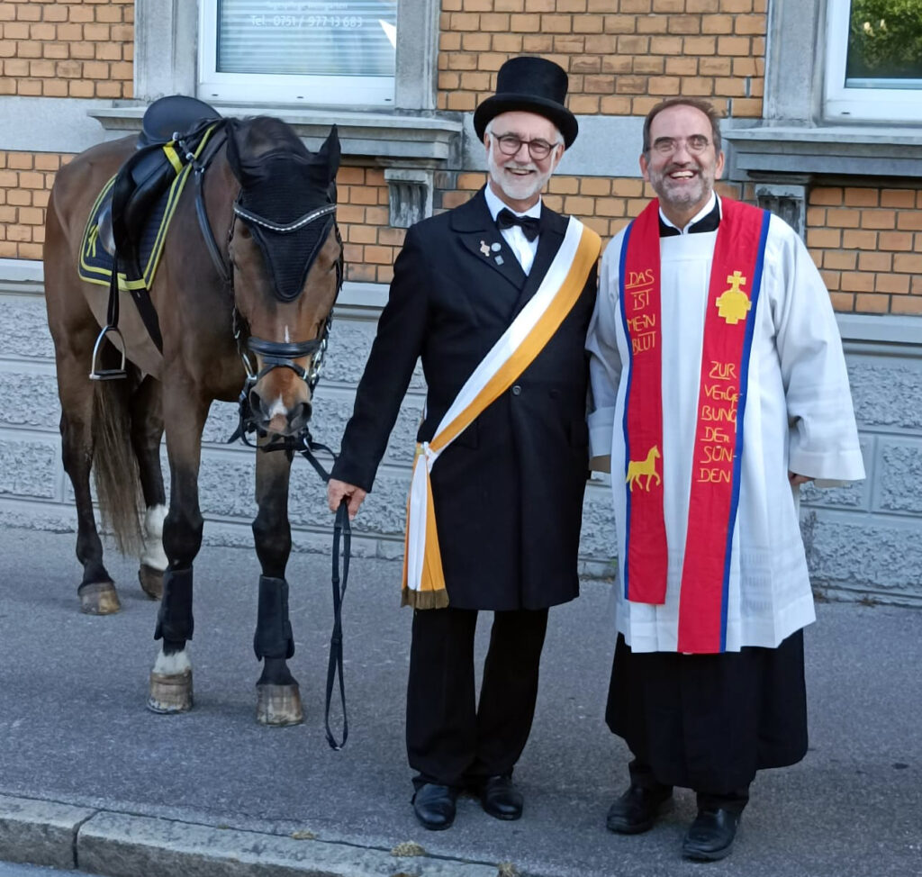 Blutreiter und Dekan Ekkehard Schmid kam zu den Ehrungen auch noch vorbei. Gemeinsam mit Pfarrer Werner, der sein Akkordeon mit dabeihatte, stimmten sie zusammen mit allen Anwesenden das Lied „Großer Gott wir loben Dich“ an.
