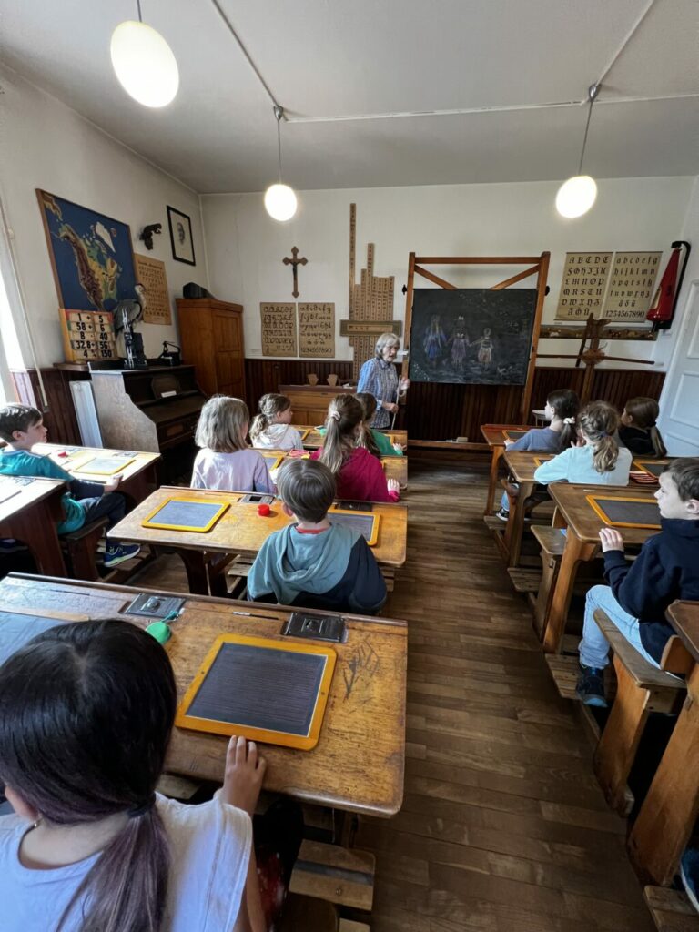In zwei aufeinanderfolgenden Blöcken lernten die Schüler/innen, wie Schule vor mehr als 100 Jahren aussah. Dass man das Holz für den Ofen in der Schulstube von Zuhause zu Fuß mitbringen und beim Beantworten von Fragen aufstehen musste, dass vor dem Unterricht die Sauberkeit der Hände überprüft und die Strafarbeiten doch noch etwas anders aussahen als heute – all das sorgte für Staunen bei den Drittklässler/innen. Auch beim Schreiben der Sütterlinschrift mit dem Griffel auf der Schiefertafel, dass die Belastbarkeit der Ohren einiger Anwesenden auf eine harte Probe stellte, wurde klar: Mit unseren heutigen Stiften schreibt es sich doch nochmal ganz anders.