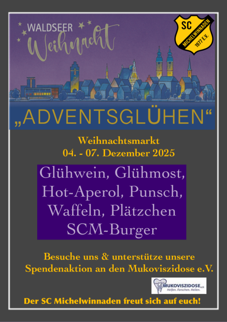 Michelwinnaden / Bad Waldsee – Vom 4. bis 7. Dezember ist der SC Michelwinnaden wieder beim Waldseer „Adventsglühen“, dem Weihnachtsmarkt der Stadt Bad Waldsee, vertreten und unterstützt den Mukoviszidose e.V. mit einer Spendenaktion. Angeboten werden Glühwein, Glühmost, Hot Aperol, Punsch, Waffeln und Plätzchen. Erstmals gibt es außerdem von Freitag bis Sonntag ab 17.00 Uhr den „SCM-Burger“ – gesmokter Schweinenacken im Brötchen.