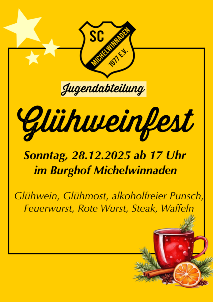 Weiter geht es traditionell vor dem Jahreswechsel mit dem Glühweinfest des SC Michelwinnaden. Die Jugendabteilung lädt am Donnerstag, 28. Dezember, ab 17.00 Uhr in den Burghof ein. Angeboten werden Glühwein, Punsch, Glühmost, Waffeln, Steak und natürlich die beliebte Feuerwurst. Der Erlös kommt der Jugend des SC Michelwinnaden zugute.