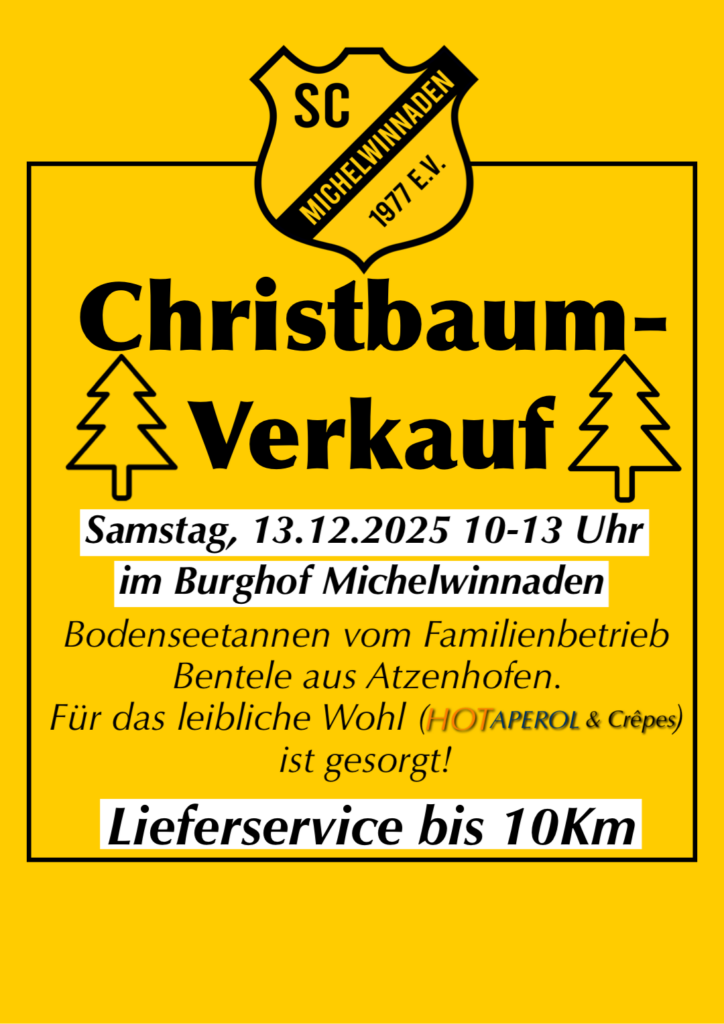 Bereits zum sechsten Mal in Folge veranstaltet der SC Michelwinnaden am Samstag, 13. Dezember, von 10.00 bis 13 Uhr einen Christbaumverkauf. Im Burghof in Michelwinnaden werden wunderschöne Nordmanntannen in verschiedenen Größen vom Familienbetrieb Bentele aus Atzenhofen verkauft. Auf Wunsch liefern die Fußballer des SCM Ihren Christbaum kostenfrei im Umkreis von 10 Kilometern bis vor die Haustür.