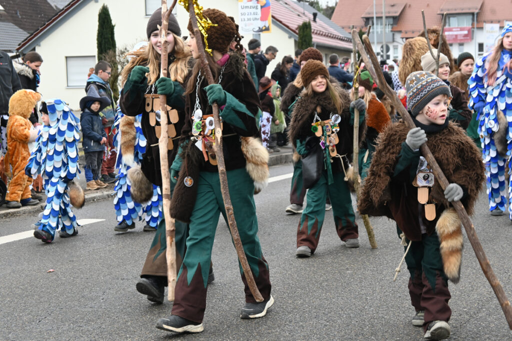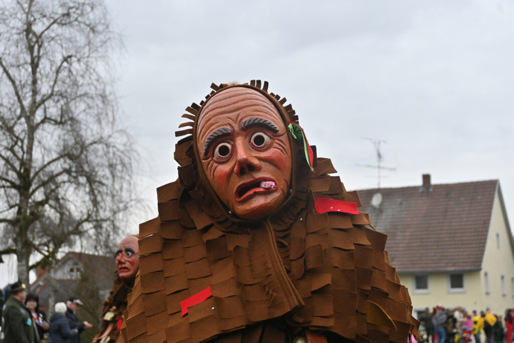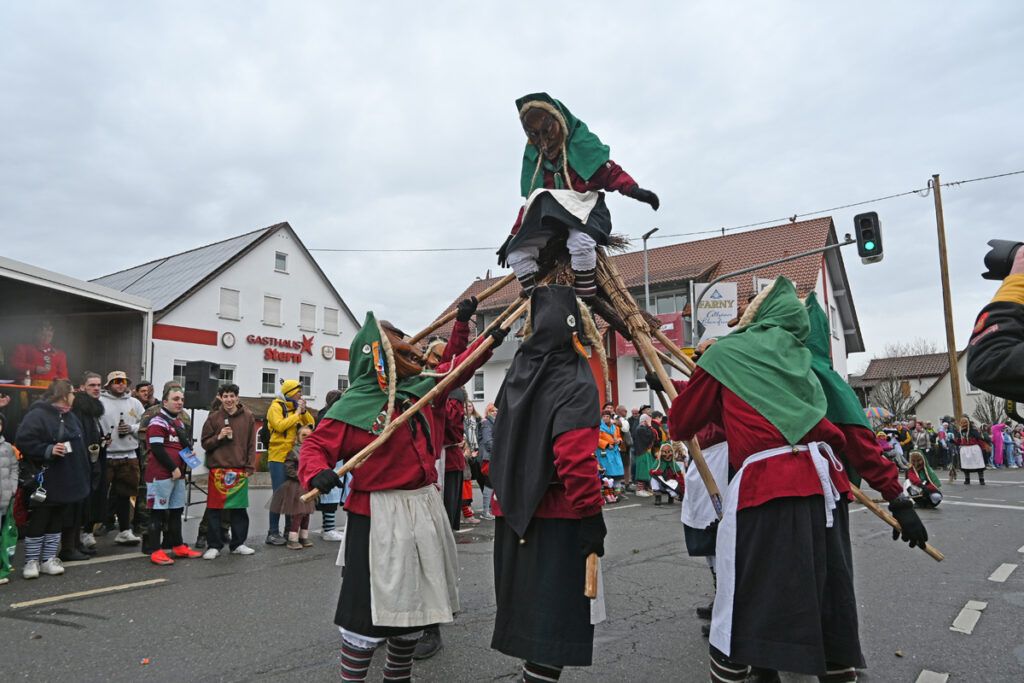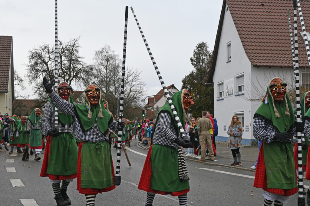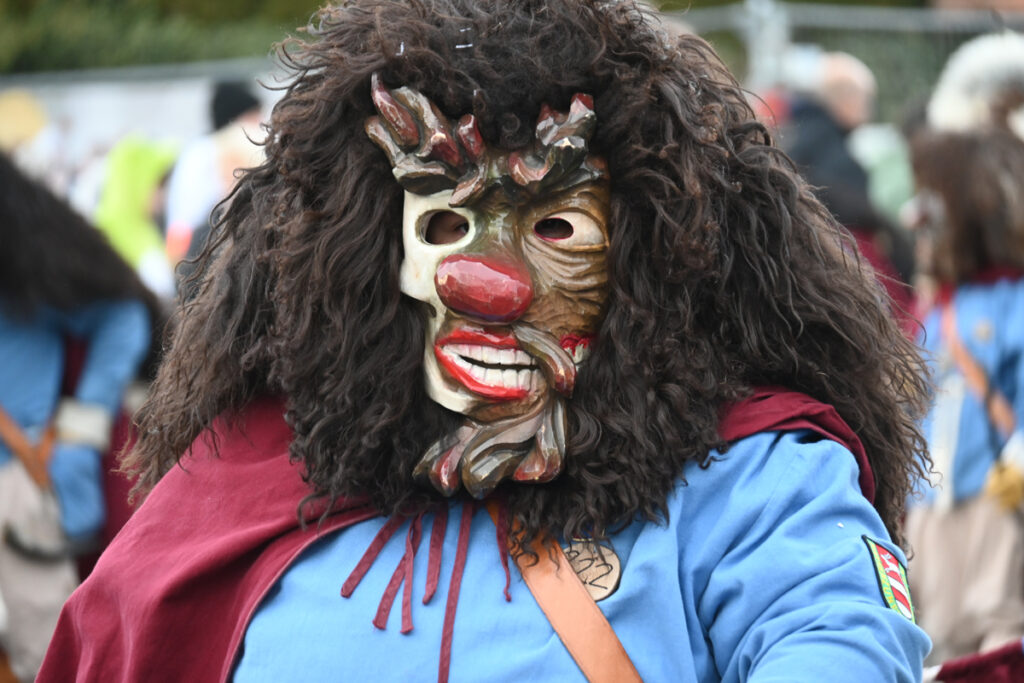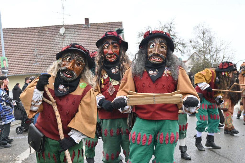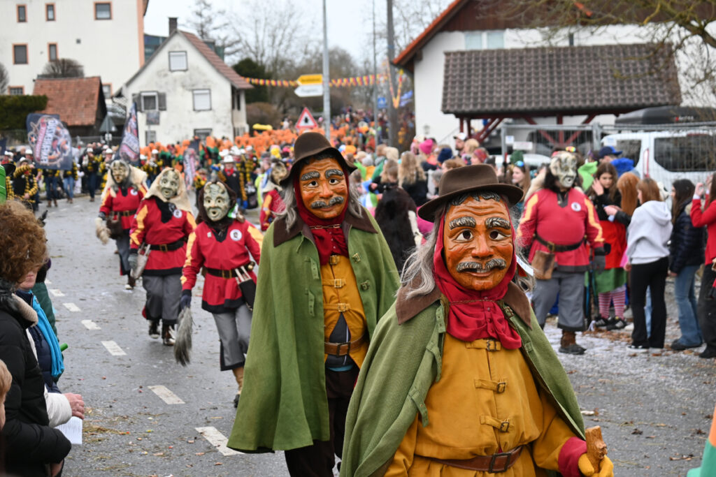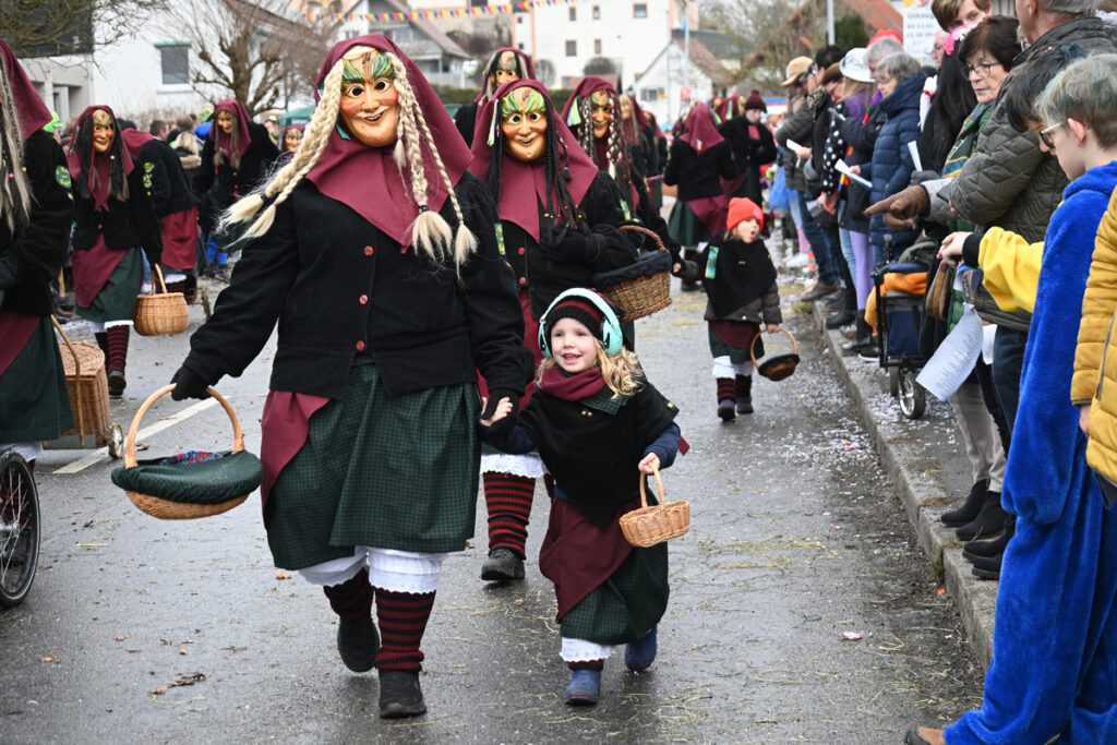 Und hinter dem Büttel kamen sie dann. Die tausende Hexen, Geister, Teufel, Räuber, und und… Der Umzugsflyer zählte nicht weniger als 72 Positionen auf. Die Zuschauer hatten ihre Freude und konnte dank eben dieses Flyers auch die richtigen Antworten auf die Narrensprüche skandieren. „Mochewangen – Knoche hange“, „Blunz Blauz –Hei Hei“, „Wicky – Hei“, „D’Liesl brennt – d’Sau rennt“, „G’Steidaweib – hot Moggla keit“, „Haldewang’r – Furzafang’r“, so vielfältig wie die Zünfte sind auch ihre Fasnetsrufe.