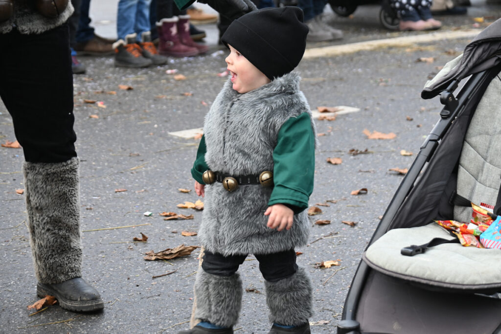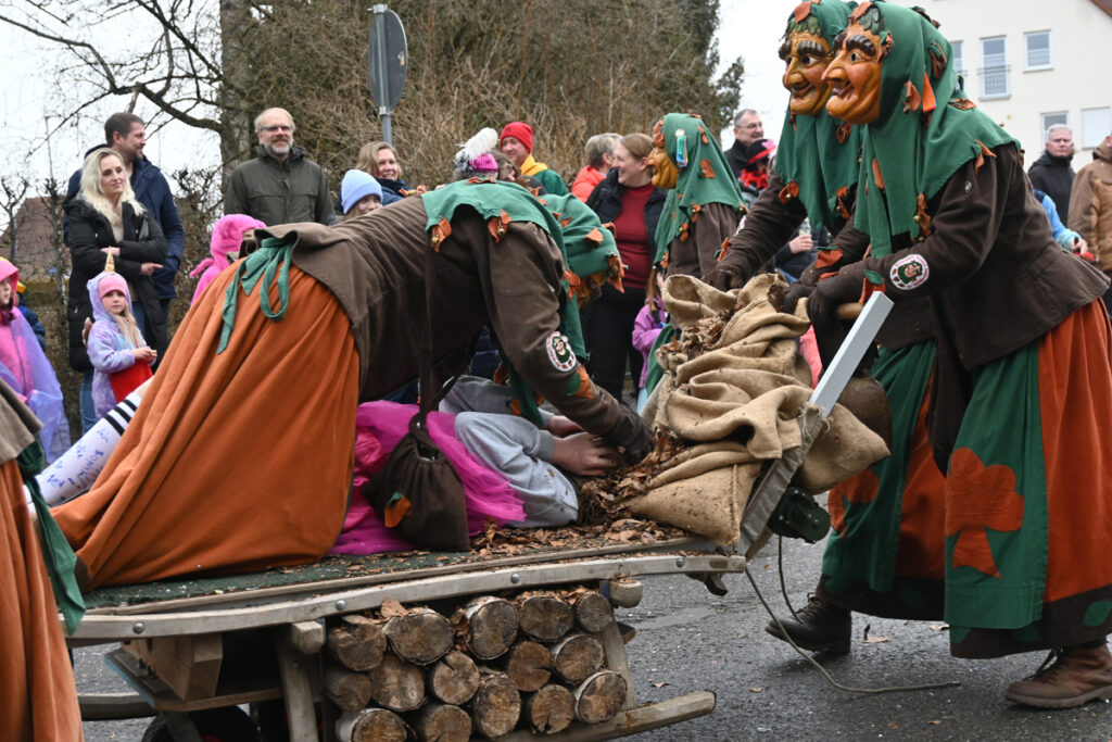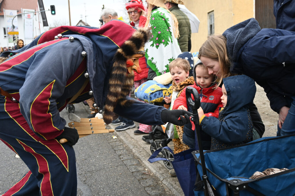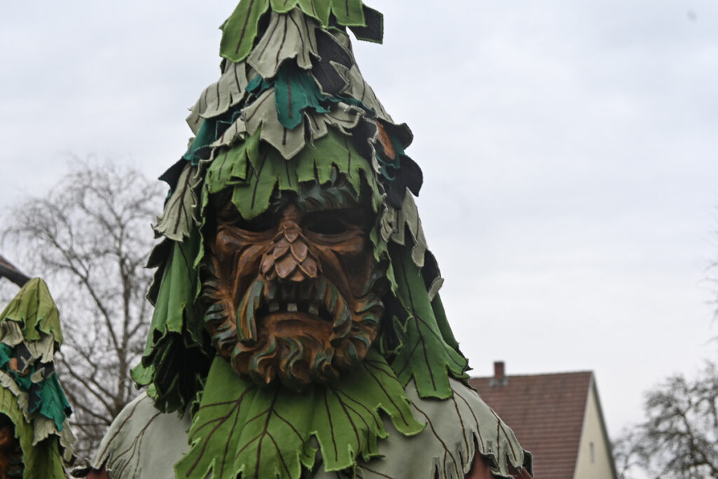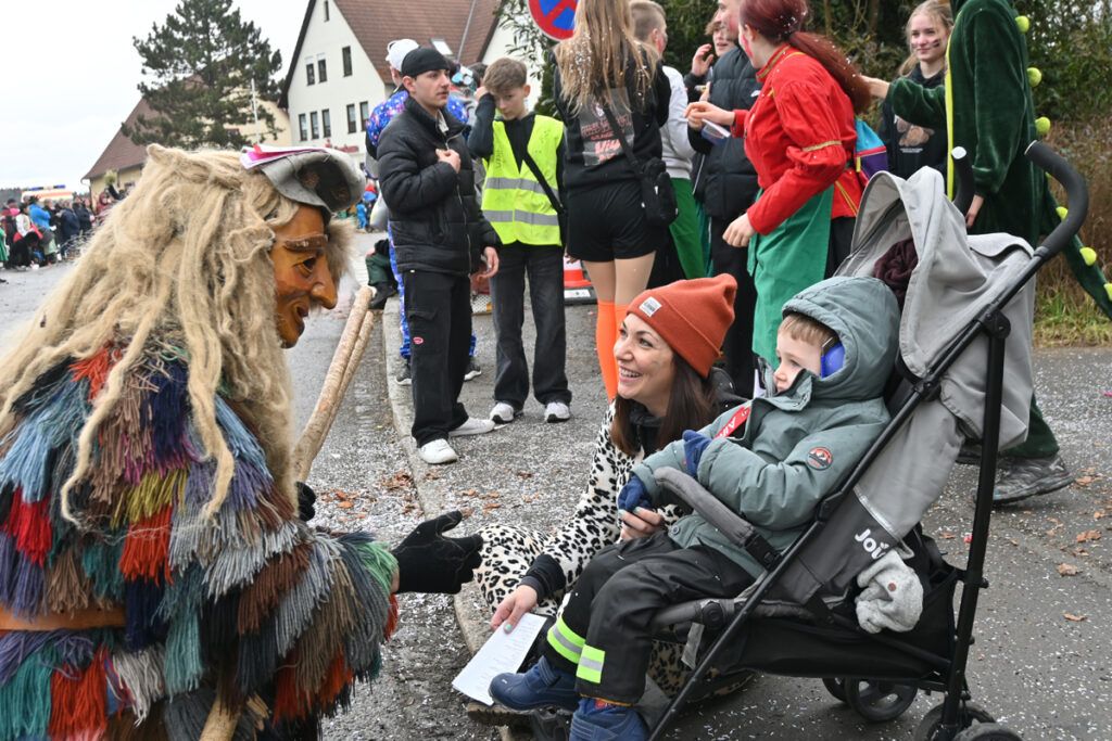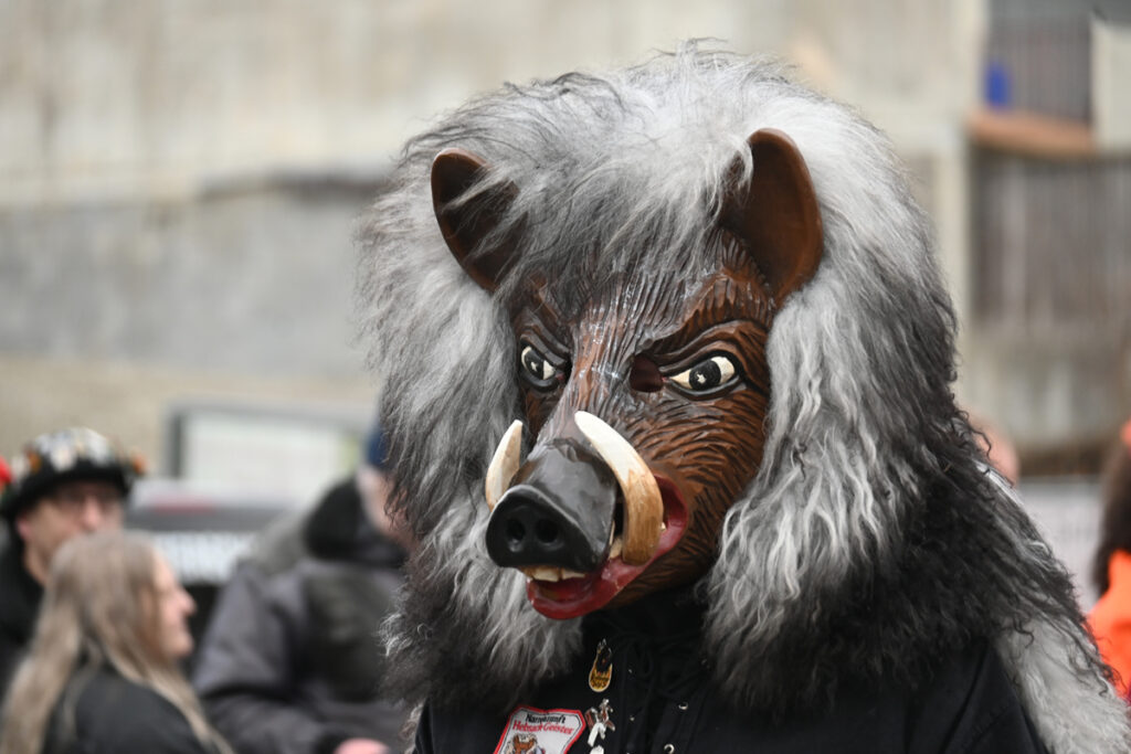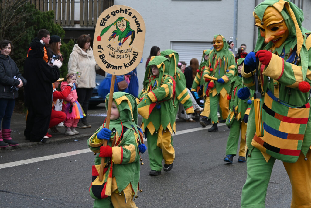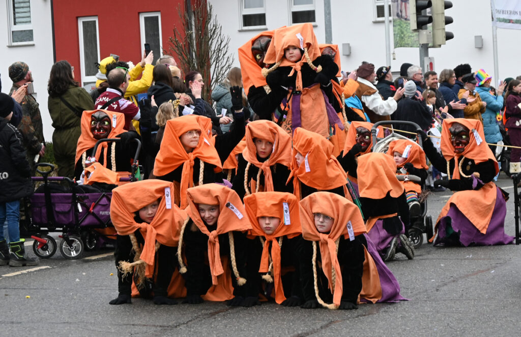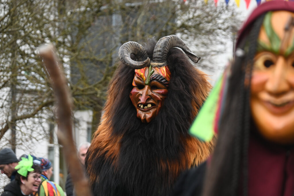 Und hinter dem Büttel kamen sie dann. Die tausende Hexen, Geister, Teufel, Räuber, und und… Der Umzugsflyer zählte nicht weniger als 72 Positionen auf. Die Zuschauer hatten ihre Freude und konnte dank eben dieses Flyers auch die richtigen Antworten auf die Narrensprüche skandieren. „Mochewangen – Knoche hange“, „Blunz Blauz –Hei Hei“, „Wicky – Hei“, „D’Liesl brennt – d’Sau rennt“, „G’Steidaweib – hot Moggla keit“, „Haldewang’r – Furzafang’r“, so vielfältig wie die Zünfte sind auch ihre Fasnetsrufe.