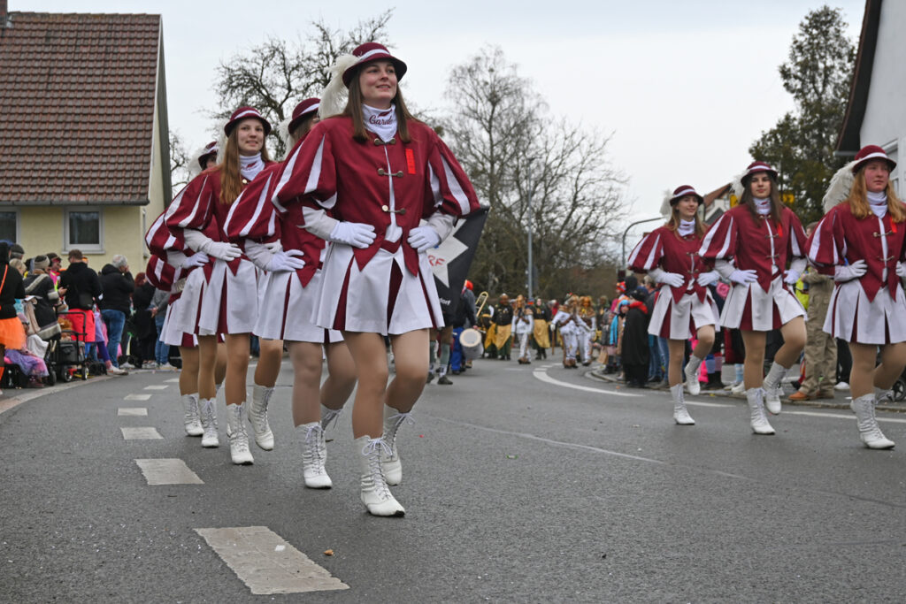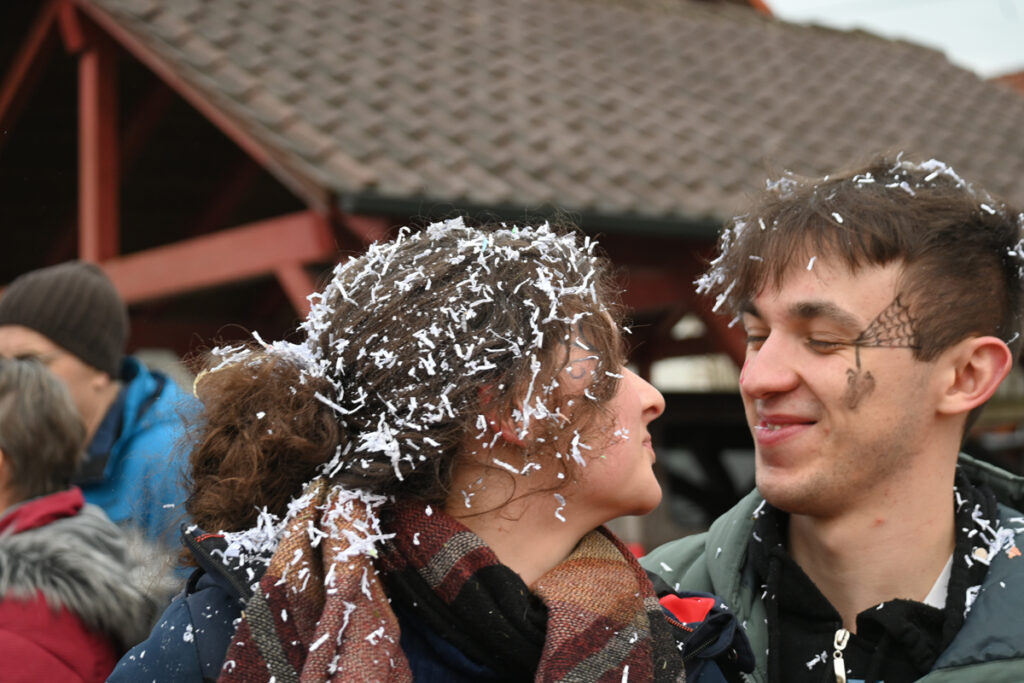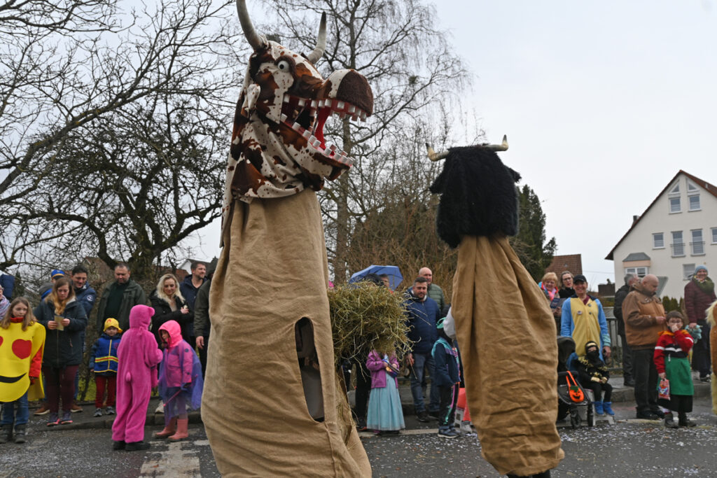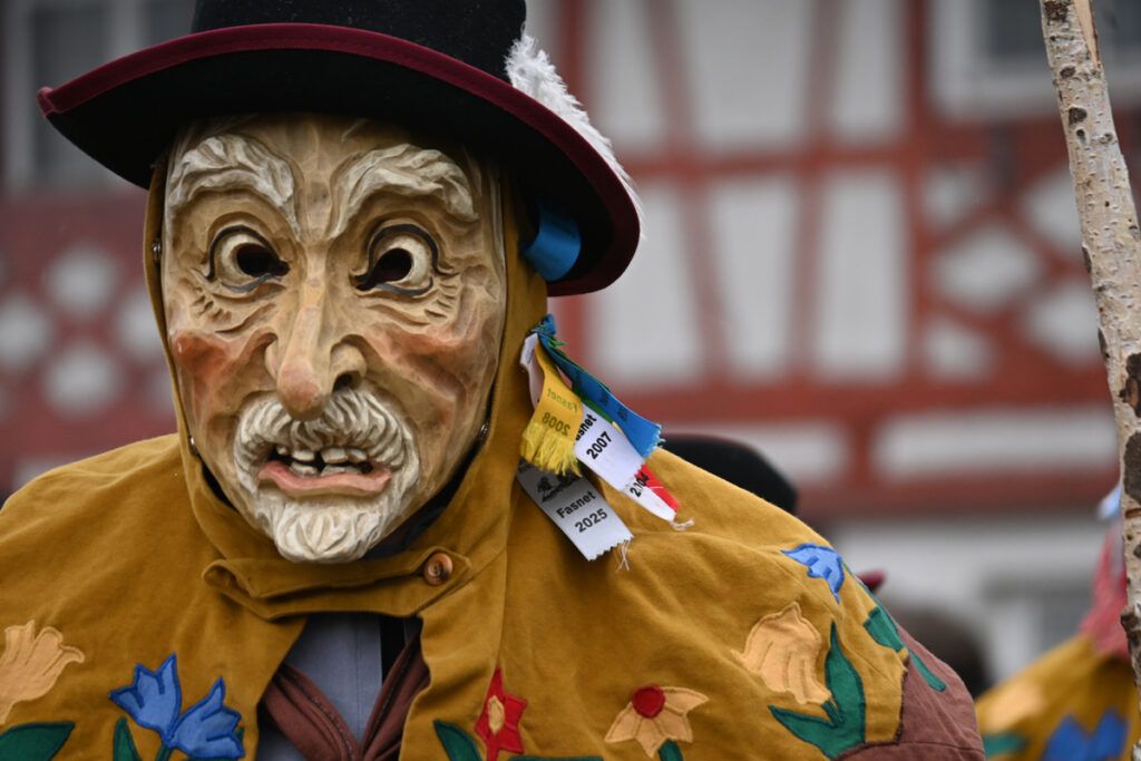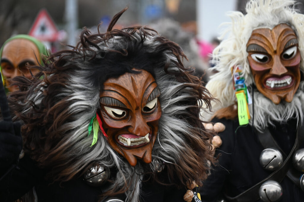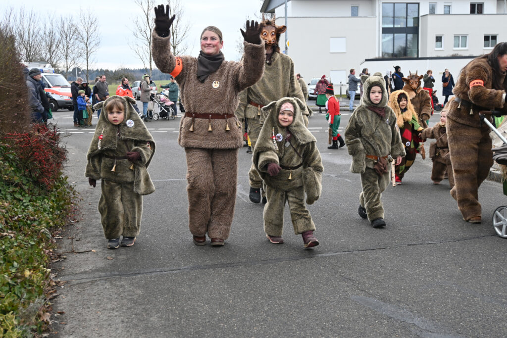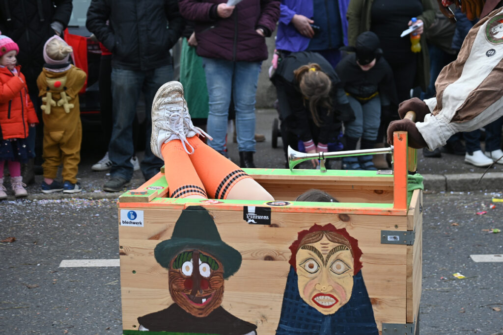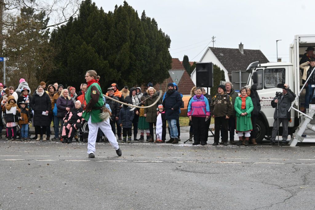 Und hinter dem Büttel kamen sie dann. Die tausende Hexen, Geister, Teufel, Räuber, und und… Der Umzugsflyer zählte nicht weniger als 72 Positionen auf. Die Zuschauer hatten ihre Freude und konnte dank eben dieses Flyers auch die richtigen Antworten auf die Narrensprüche skandieren. „Mochewangen – Knoche hange“, „Blunz Blauz –Hei Hei“, „Wicky – Hei“, „D’Liesl brennt – d’Sau rennt“, „G’Steidaweib – hot Moggla keit“, „Haldewang’r – Furzafang’r“, so vielfältig wie die Zünfte sind auch ihre Fasnetsrufe.