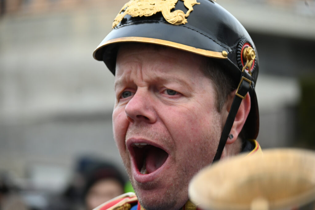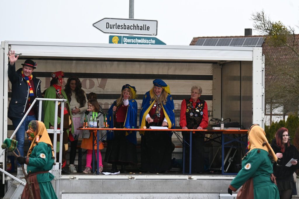 Die Wickinger aus Wilhelmsdorf hatten ein leibhaftiges Wikingerboot mit im Umzug dabei, das nach allen Richtungen der Windrose unterwegs war. Die Narren mit den langen Auszugsscheren trieben mit den Zuschauern allerhand Schabernack. Auch der ehrwürdige Dachauer des Reporters wurde eine Beute der Schere und erst wieder gut mit Konfetti gefüllt dem Besitzer auf den Kopf gestülpt. Außer Konfetti gab’s auch eine gute Ladung Heu in den Kragen und manches Mädchen am Umzug bekam die Haare verwuschelt und mit ordentlich Konfetti verziert. Etliche Hexen hatten ihre Karren mit „wohlriechenden“ Hexenfeuern dabei. Wie immer waren auch hier meist die jungen Mädchen bevorzugte Kandidatinnen für eine Mitfahrt auf dem Hexenkarren. OB Matthias Henne ließ sich ebenfalls in Reute sehen. Vom Tribünenwagen aus verfolgte er zusammen mit der Präsidentin der Narrengilde das Treiben.