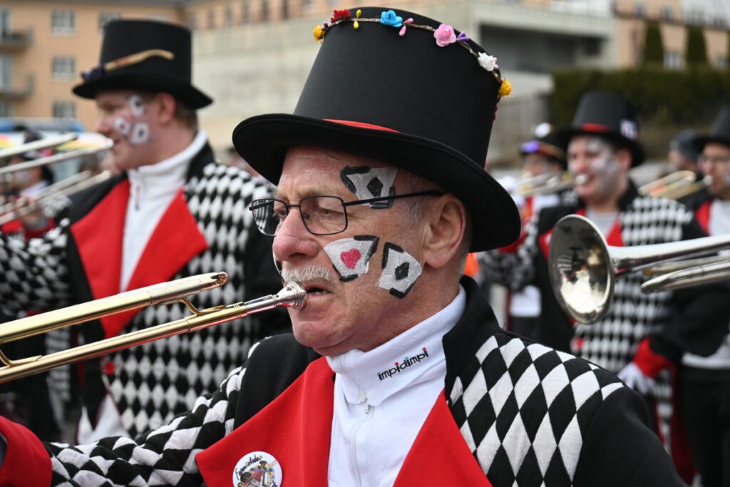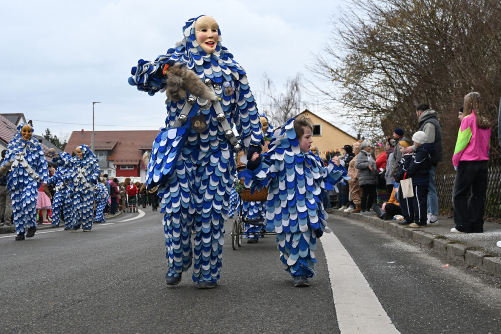 Neben dem Reutener Narrenlied, komponiert 1985, darf die Gilde 50 Jahre „Blaue“ feiern. Im blauen Häs, bestehend aus dem namensgebenden blauen Umhang und Hut, kleiden sich seit 1975 der Narrenrat und die Vorstandschaft. Der Umhang ist mit gestickten gelben Pfadlilien verziert, die auf das Wappen der Ortschaft zurückzuführen sind. Da hatte die frischgebackene junge Vorständin Julia Schuster und ihr Team in Vorfeld allerhand zu ackern, um dieses für Reute einmalige Ereignis über die Bühne gehen zu lassern. Und als Beobachter kann man nur sagen: Chapeau Reutener, das habt ihr gut gemacht.