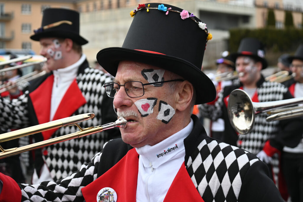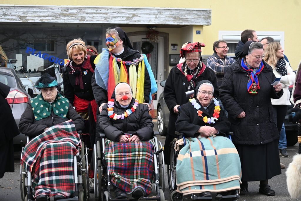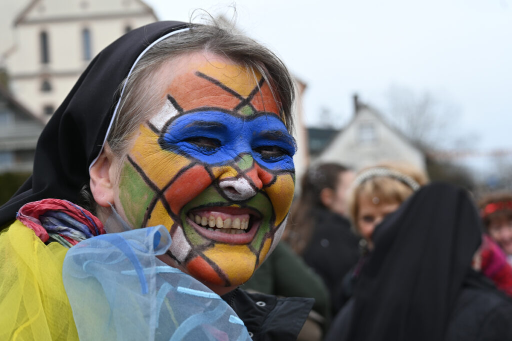 Zuchauer waren mindestens so viele da wie Hästräger. Dicht an dicht säumten sie den Umzugsweg in der Dorfmitte. Auch hier gab es viele Mäschkerle zu sehen. Unter ihnen, erst auf den zweiten Blick als überhaupt nicht verkleidet, sondern nur gut geschminkt, ein halbes Dutzend Nonnen aus dem Kloster. Auch sie hatten ihren Spaß beim Umzug. Die Gewinner waren die Kinder, die sich ihre Taschen mit einem Jahresvorrat an Guetsla füllen konnten. Nach guten zwei Stunden beschlossen die Reutener samt ihrem Fanfarenzug den Umzug. Bald rollten die Busse wieder ab und die Reutener konnten sich ganz ihrem Narrentreiben hingeben.