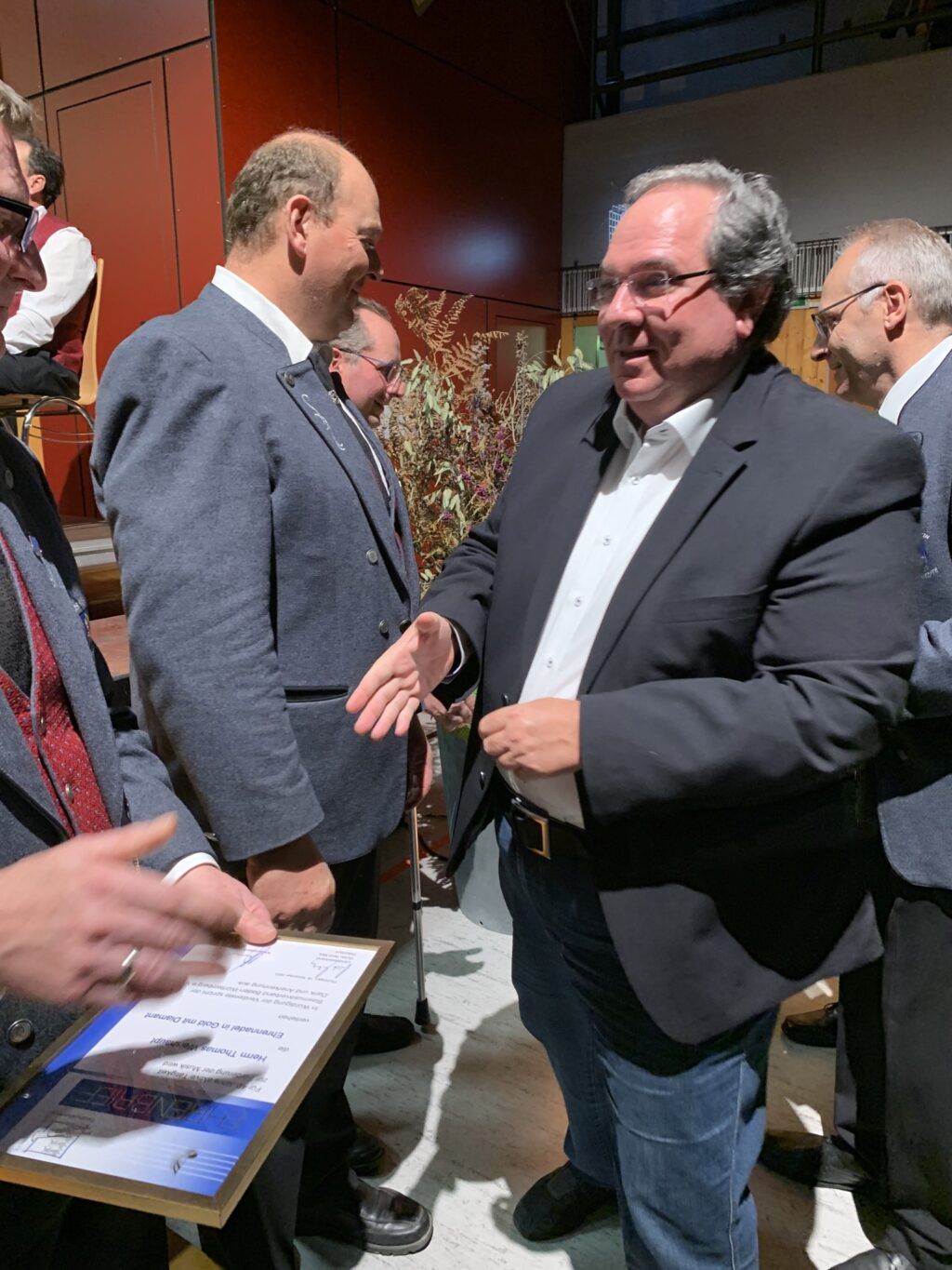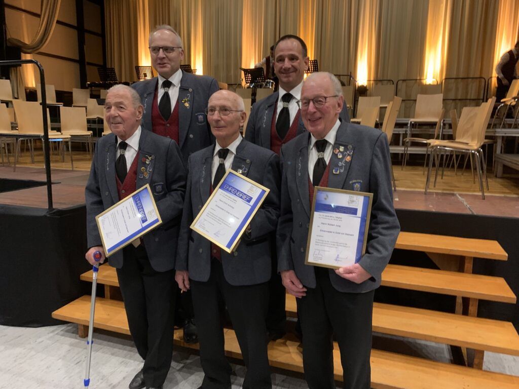 Schließlich wurden die drei im Wortsinne altgediente Musikanten vom Kreisvorsitzenden aufgerufen: Robert Jung (Klarinette), der 70 Jahre im Musikverein Bergatreuet ist, Erich Schorpp (Schlagzeug) für 75 Jahre und Erwin Jung (Saxophon) für ebenfalls 75 Jahre. Für ihre lebenslange aktive Tätigkeit gab es natürlich die Ehrennadel in Gold und Diamant mit Ehrenbrief. Diese Männer haben neben ihrer Mitwirkung im Musikverein auch Tanzmusik und vielerlei Auftritte am Akkordeon in ihrer beispiellosen Biographie aufzuweisen! Und sie sind alle noch aktiv im Musikverein Bergatreute dabei.