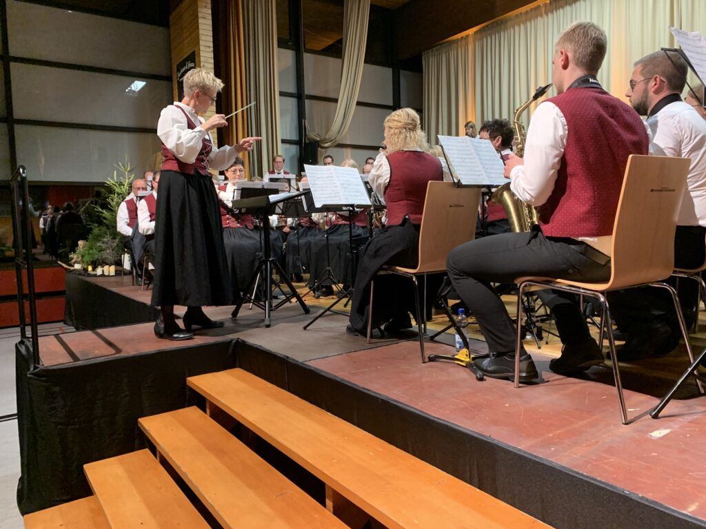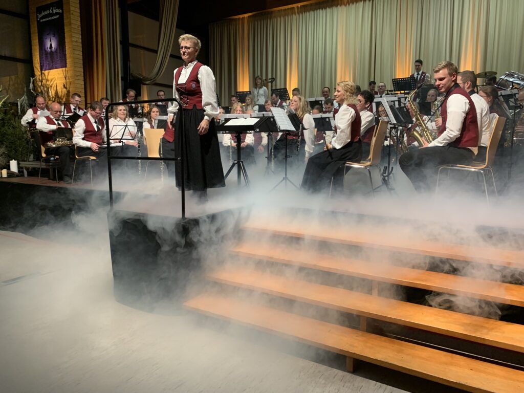 Nicht nur dem Publikum, sondern auch den Geehrten war der folgende „Marsch der Titanen” gewidmet, ein inzwischen einschlägig bekannter Blechklassiker. Unter dem leidenschaftlichen und mitreißenden Dirigat von Anja Vinçon ging dieses fanfarenähnliche Stück förmlich unter die Haut. Mit „In Vita Optimum” gab es nun eine Lebensweisheit: Man solle sich doch in guten und schlechten Lagen stets für das jeweils Beste entscheiden, meinte Verena Baumann. Das typische und recht anspruchsvolle Oberstufenstück mit böhmischer Handschrift wurde absolut präzise vorgetragen. Das folgende “The Witch And The Saint” brachte die Hexen wieder ins Spiel. Baumann erinnerte zuvor an den Hexenwahn und an die teuflische Schrift des Heinrich Institoris mit dem Titel “Hexenhammer” aus dem Jahr 1486, die die Verfolgung Unschuldiger legitimierte und förderte. Sie illustrierte das mit dem Schicksal zweier Schwestern, die eine Nonne, die andere Hebamme in Ellwangen. Mit donnerndem Auftakt und Soli von Horn und Saxophon wurden die Besucher in die Dramatik und Düsterheit, in die finstere Zeit des Suchens nach Sündenböcken versetzt.