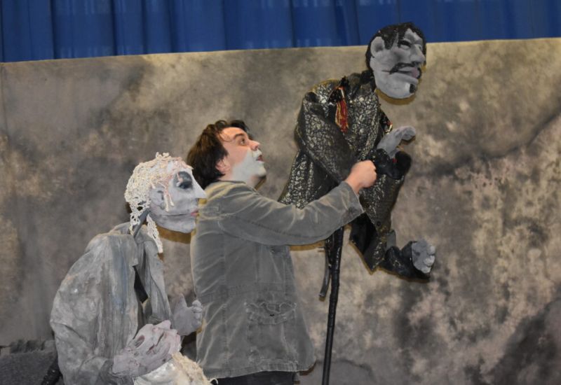 Die Deutschkurse der Abiturienten waren jedenfalls größtenteils begeistert. Zum einen von der Inszenierung des Stückes, der Bühne, welche sie traditionell mit aufbauen, vor allem aber von der schauspielerischen Leistung Rouven Honnefs, der im Nachgespräch sehr offen auf die Fragen der Gruppe einging. Auch am Tag danach lobten die Klassen dessen schauspielerische Ausdrucksstärke und Kondition. Seine unglaubliche Vielseitigkeit in Ausdruck, Intonation und sein Agieren mit den einzigartigen Puppen ließ auch schwierige Passagen des Stückes verständlich werden. Honnefs Stimmgewalt hauchte den Figuren nicht nur Leben ein, sondern verlieh den ihnen ihre individuellen Noten. Temporeich verwob er in seinem Spiel die Figuren mit Woyzecks Spiel, sodass kaum noch spürbar war, dass es sich um eine Einmanninszenierung handelte. Rund 180-mal hat Honnef den Woyzeck nun schon gespielt und es ist ihm nicht leid geworden, im Gegenteil, habe er viele Passagen immer wieder verfeinern können. Neben Details zum Stück ist für Schüler und Schülerinnen immer auch interessant, Einblick in den Alltag eines Schauspielers gewinnen zu können. Fragen bezüglich des Textlernens, der Proben und der Verantwortlichkeiten für die Bühne wurden gestellt und offen beantwortet. Wie immer bei Vorstellungen der Mobilenspiele vom Karlsruher Theaterpädagogen und Regisseur Thorsten Krailos wurde viel geboten in puncto Bilderwelten, akustischer und spielerischen Einlagen und Finessen. Dank an das gesamte Team um Thorsten Krailos sowie den Ausstatter und Puppenbauer Marcus Stiefel-Dürr aus Karlsruhe.