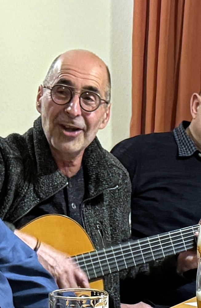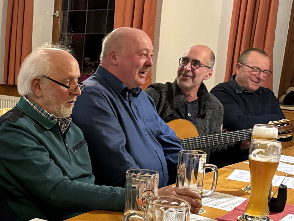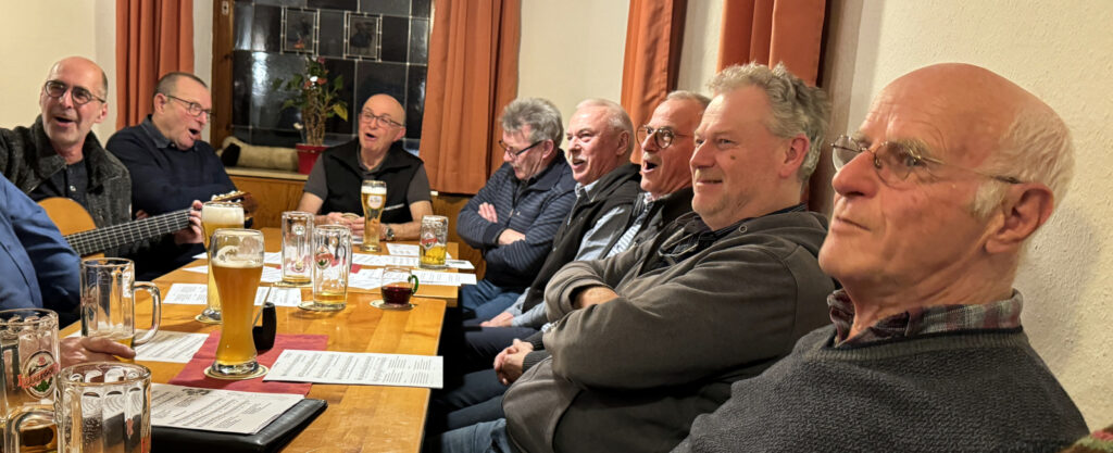 Wolfgang Gustke, der langjährige Reimer und Dichter des MCH, nahm das Telefon zur Hand, rief so nach und nach die Sänger an und vermittelte einen Termin für den 29. Februar im Gasthaus „Burgstock“ in Hittisweiler. Zwanzig ehemalige und auch noch aktive, langjährige Sänger hatte er informiert und 17 waren gekommen. Das war imponierend und dass auch Ehrendirigent Barny Bitterwolf, der 1988 die Chorgemeinschaft gründete und 20 Jahre lang das Dirigat innnehatte, sich Zeit nehmen konnte, war höchst erfreulich. Barny hatte eines seiner vielen Instrumente mitgebracht, nämlich die handliche Gitarre. Damit war klar, dass es nicht beim Plaudern blieb, sondern auch noch gesungen wurde. Er hatte zudem Liedblätter mitgebracht mit neu verfassten urschwäbischen Texten. Auch allseits bekanntes Liedgut gehörte dazu. Eine frohmachende Sangesrunde war so gesichert. Spannend war es allemal, ob nun gemeinsam, im Kanon oder auch Zwiegesang mit doppeltem Text gesungen wurde. Es hat allen sichtlich Spaß gemacht. Auch die Gäste im Gastraum nebenan fühlten sich nicht gestört. Einer der Gäste äußerte sich so: „Wir sind schon eine halbe Stunde länger geblieben wegen des netten Gesangs.“ So kamen also alle auf ihre Kosten, die Gäste wie auch die Oldies des MCH.