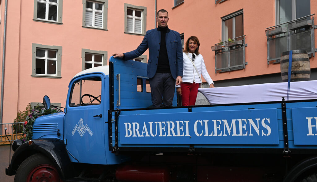 Auf einem geschmückten historischen Lkw in den blauen Härle-Farben ließen sich OB Henne und Bürgermeisterin Monika Ludy auf den Festplatz fahren.