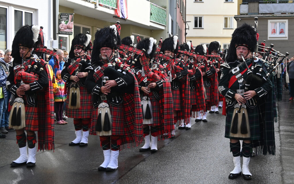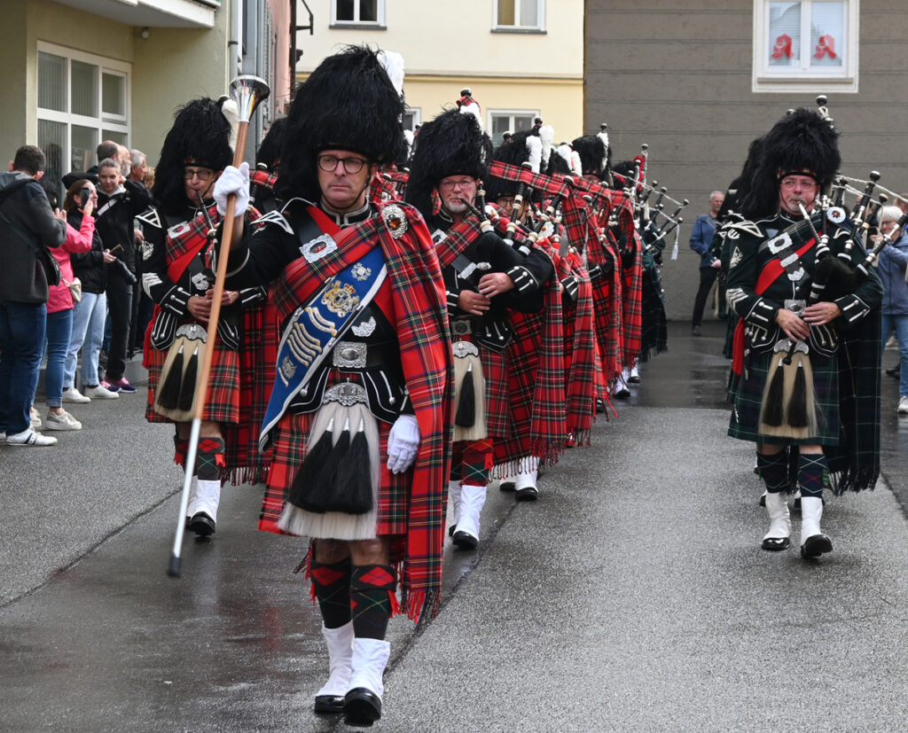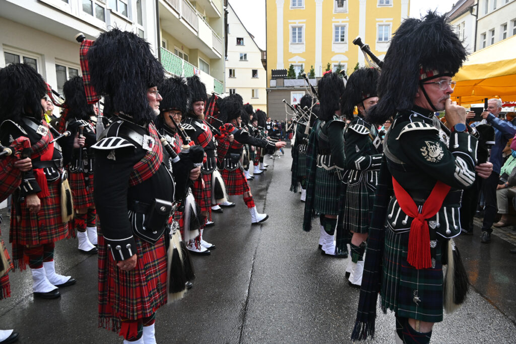 Die Bad Waldseer Highland Pipes and Drums haben Verstärkung von ihrer schottischen Patenband aus Wick, zu erkennen am grünen Tartan (rechts im Bild).
