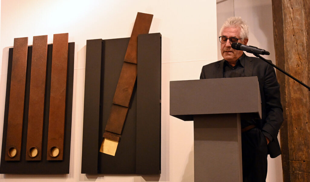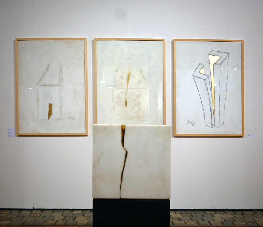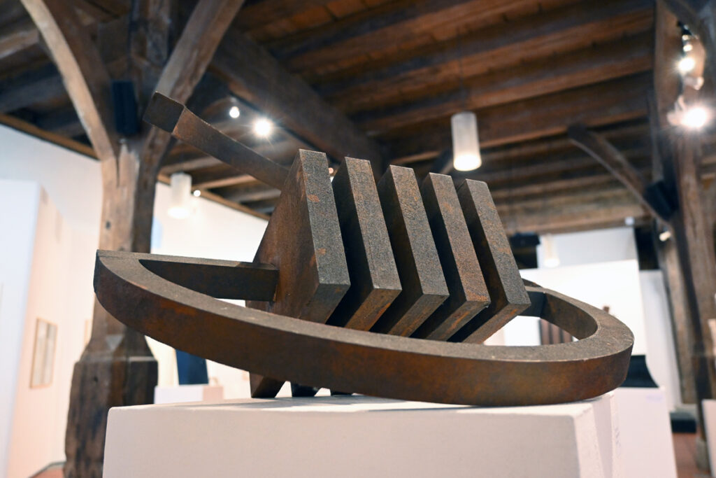 Die Otterbach-Ausstellung gibt auch einen schönen Einblick über die Entwicklung seines Werkes über die langen Schaffensjahre. Aus einer relativ frühen Epoche stammt der gespaltene und mit Blattgold überhöhte Marmorquader. Die dazugehörigen Grafiken datieren zurück bis ins Jahr 1989. Hier sieht man auch, dass ein künstlerisches Werk, das ohne Schnickschnack, ohne dem jeweiligen Zeitgeist nachzurennen, auch nach 35 Jahren noch modern ist und in unsere Zeit passt. Aus einer jüngeren Schaffensperiode stammen die filigranen Objekte aus einen Material, das wie rostiges Eisen aussieht.