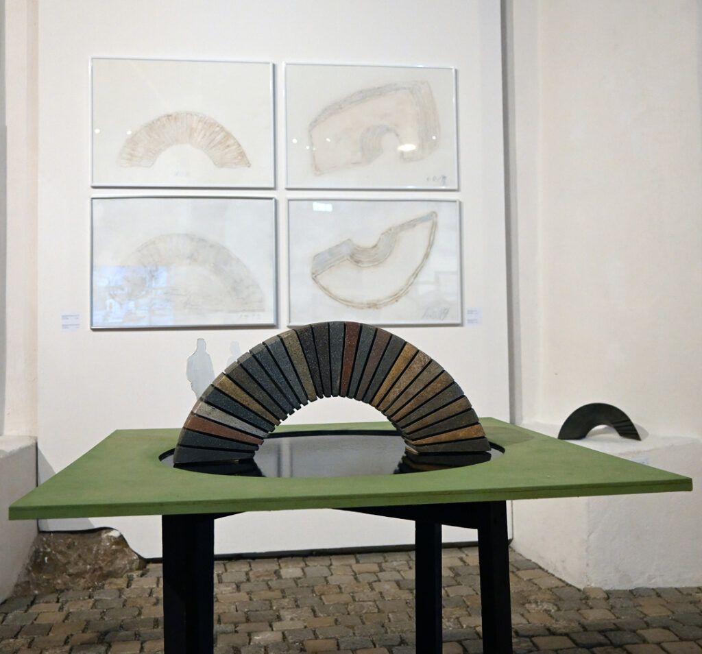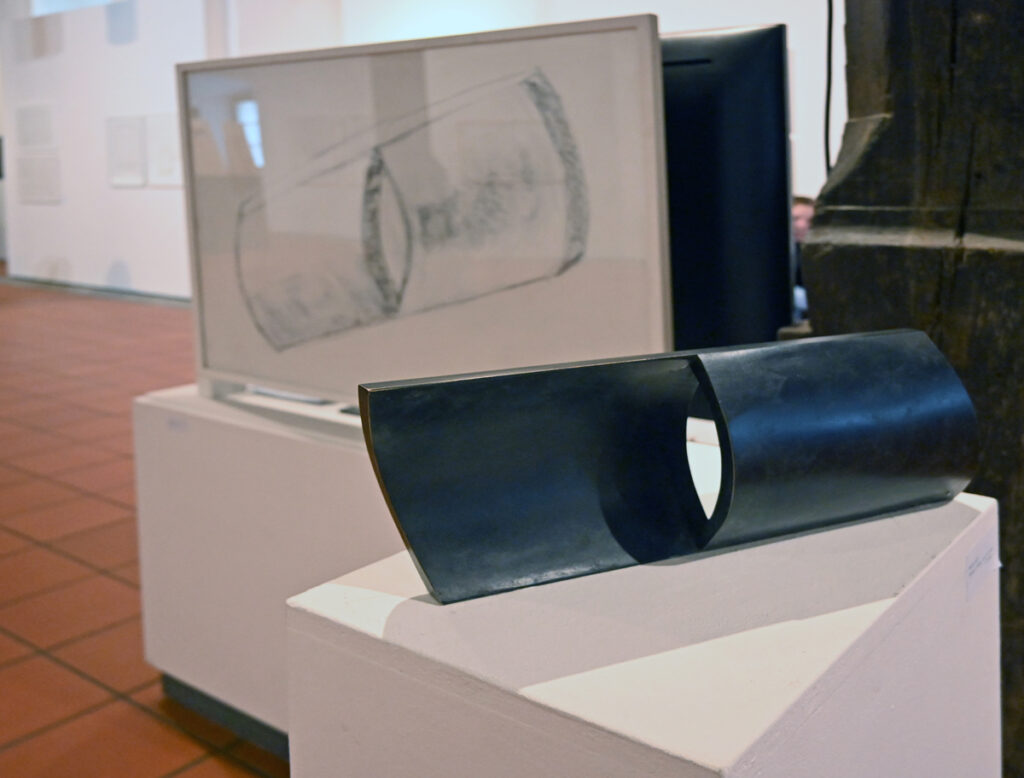 Die Ausstellung öffnet den Blick in die Arbeitsweise des Künstlers; man kann dem Bildhauer Axel F. Otterbach quasi bei der Arbeit über die Schulter zu schauen. Besonders gut zu sehen beim „Brückenstein“, der als Modell in der Ausstellung steht. Daneben und dahinter hängen Bilder, die skizzenhaft den Entstehungsprozess oder besser gesagt die Auseinandersetzung des Künstlers mit dem Thema zeigen. Wie nähert sich Otterbach dem endgültigen Werk an? Wie hätte es auch anders aussehen können, als es jetzt auf dem Grabenmühlplatz steht. Dabei ist jede Skizze, jede Grafik auch ein eigenständiges Werk, das losgelöst aus dem Ausstellungs- und Skulpturenkontext alleine für sich wirkt, steht, zu Hause an der Wand einen Platz beansprucht.