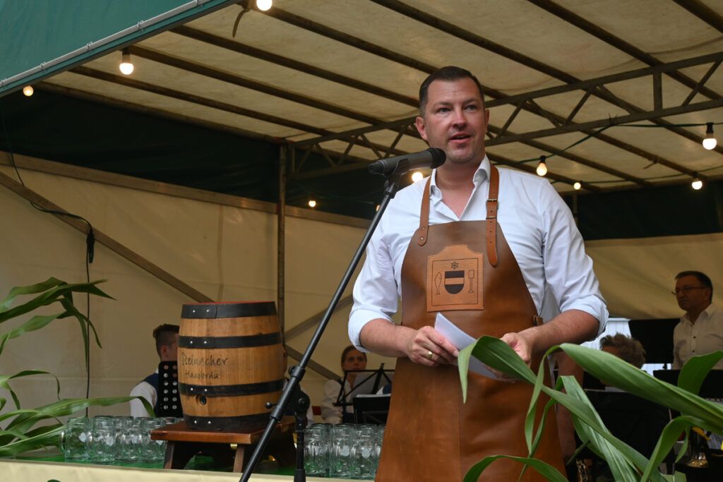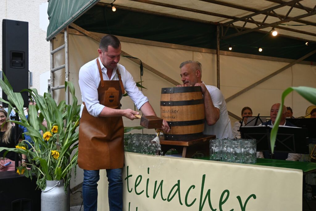 … 3, 2, 1. Matthias Henne schwingt den Schlegel. Nach zwei sicheren, gefühlvollen Schlägen sitzt der Hahn in Spundloch und das frische Bier vom Steinacher Hausbräu schäumt in die bereitgehaltenen Krüge. Auch als Mundschenk hat der OB gut zu tun, denn viele Hände strecken sich nach dem ersten Bier.