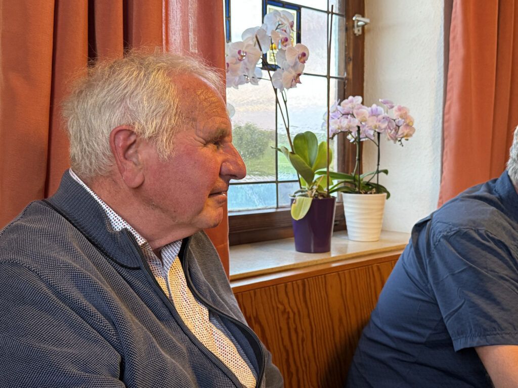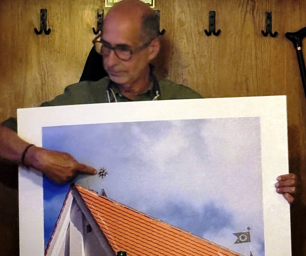 Das jetzige Treffen im Mai 2025 wird all den Gekommenen in bester Erinnerung bleiben, denn Barny nutzte es auch zu einem historischen, regional bezogenen Rück- und Ausblick. So brachte er auch ein Foto mit von der Kirche St. Leonhard in Gaisbeuren. Mal ehrlich, wer hat schon mal darüber nachgedacht, welche Bedeutung diesen Insignien („Morgenstern als Schlagwaffe“ und „Bauernfahne“) auf dem dortigen Kirchendach zukommt. Jedenfalls waren alle dankbar für so viel Historisches und zugleich Unterhaltsames an diesem Abend und ganz besonders auch für das von Barny gespendete Buchgeschenk für jeden.
