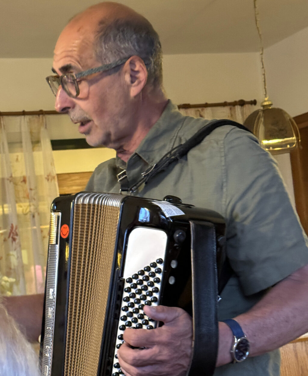 Dieses Mal, jetzt im Mai, waren der Einladung 16 langjährige Sänger, die schon während Barnys Dirigat von 1988 bis 2008 zur MCH-Sängerschar gehörten, gefolgt. Bei den bisherigen Treffen im Nebenzimmer wurde natürlich auch kräftig gesungen, so dass der Gesang durchaus von den Gästen im Hauptgastraum vernehmbar war. Dafür gab es stets Komplimente. Die Gäste waren dieses Mal genauso überrascht wie die Sängerschar auch, denn das Liedgut, das Barny mit der Gitarre und auch mit dem Akkordeon begleitete, war bis auf „Im Märzen der Bauer“ mehr oder weniger unbekannt. Wer kennt schon Bauernlieder aus 5 Jahrhunderten.