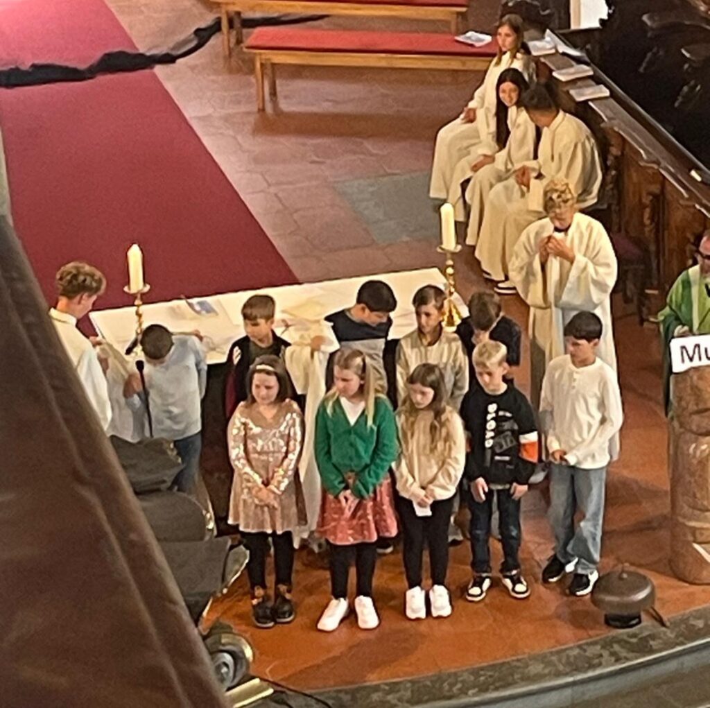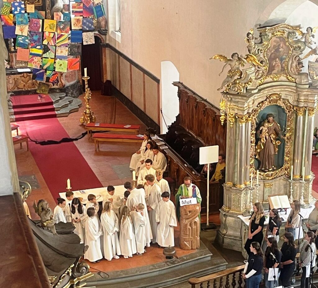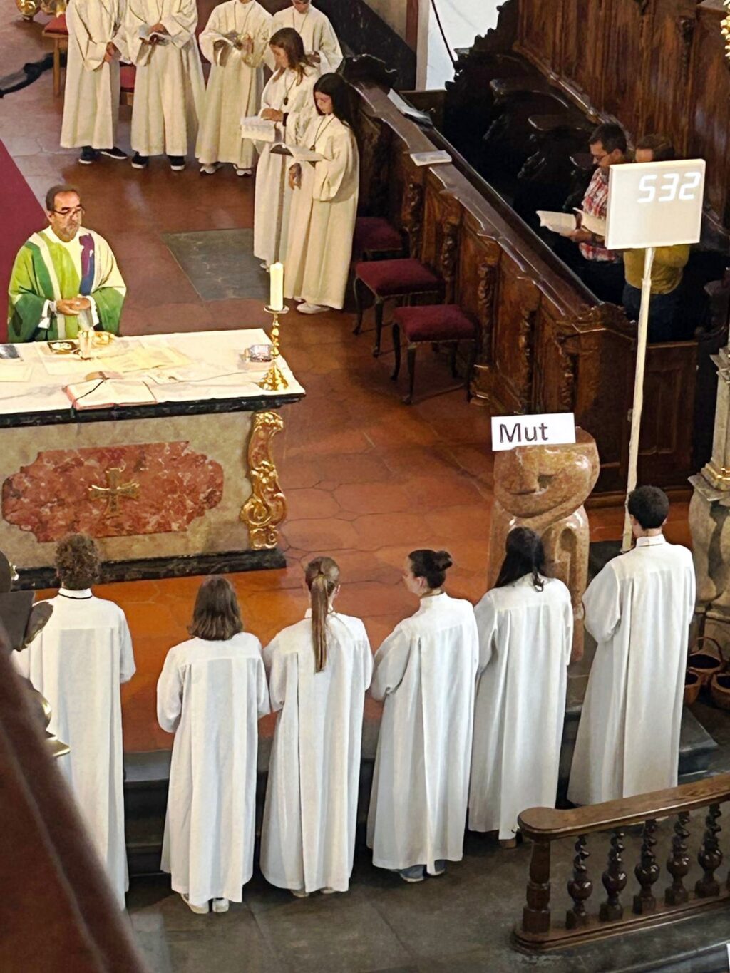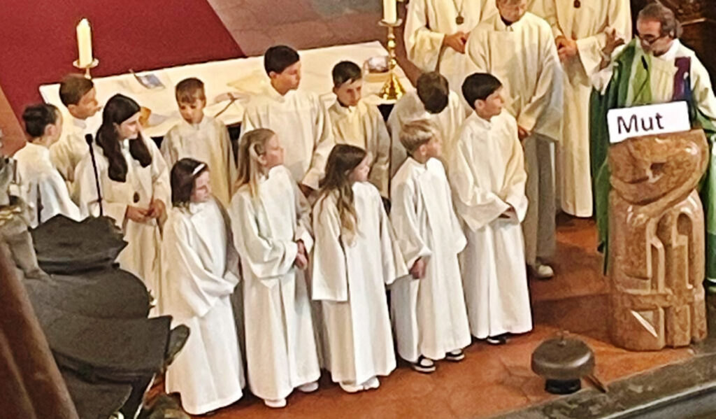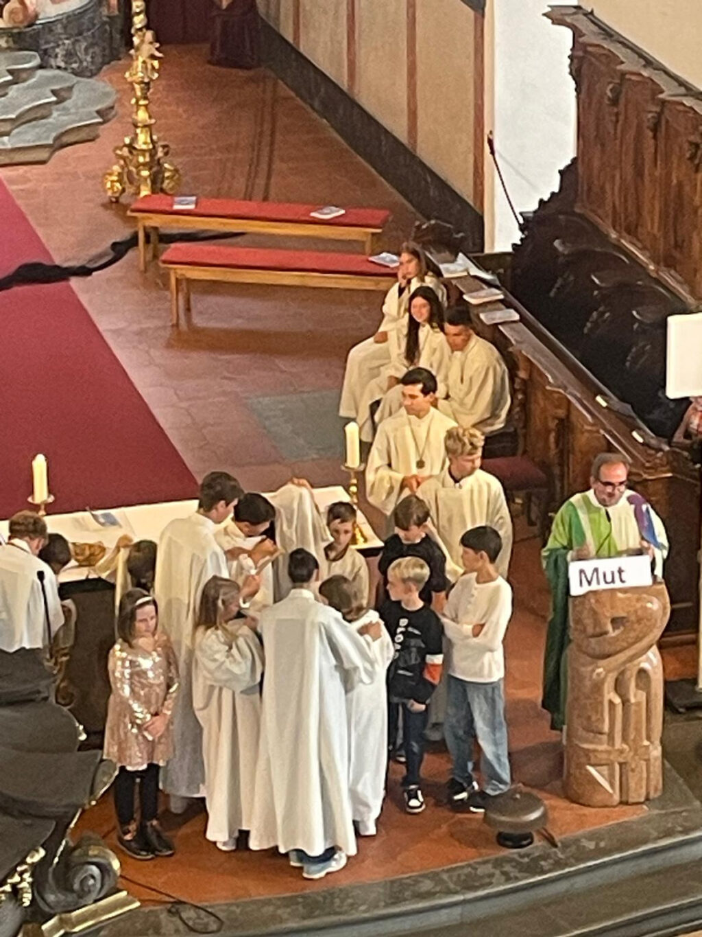 Pfarrer Stefan Werner wendet sich den elf soeben in den Dienst aufgenommenen Ministranten zu. In der jugendgerechten Liturgie hatte das Stichwort “Mut” eine Rolle gespielt.