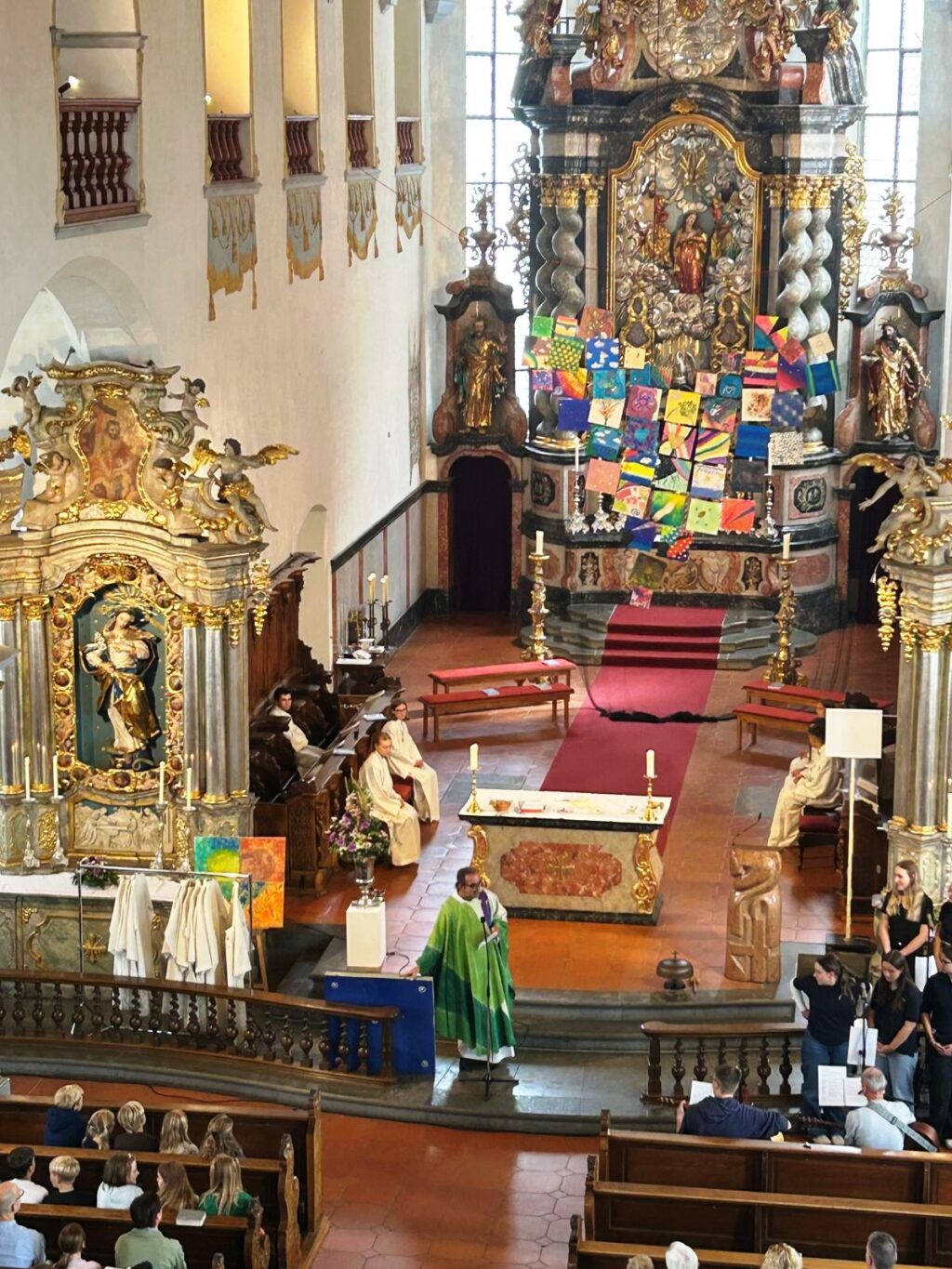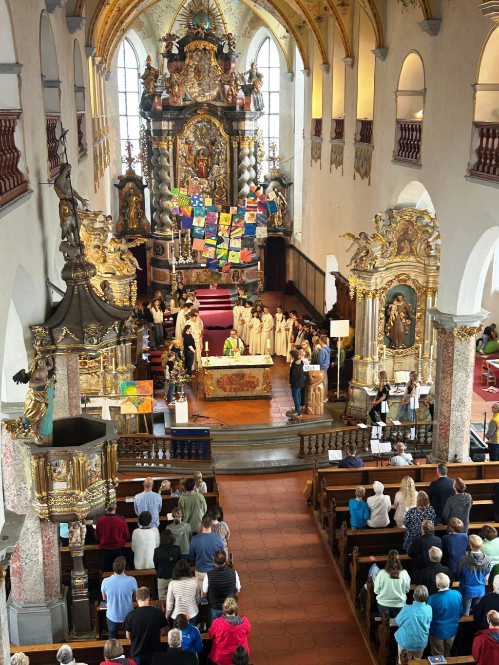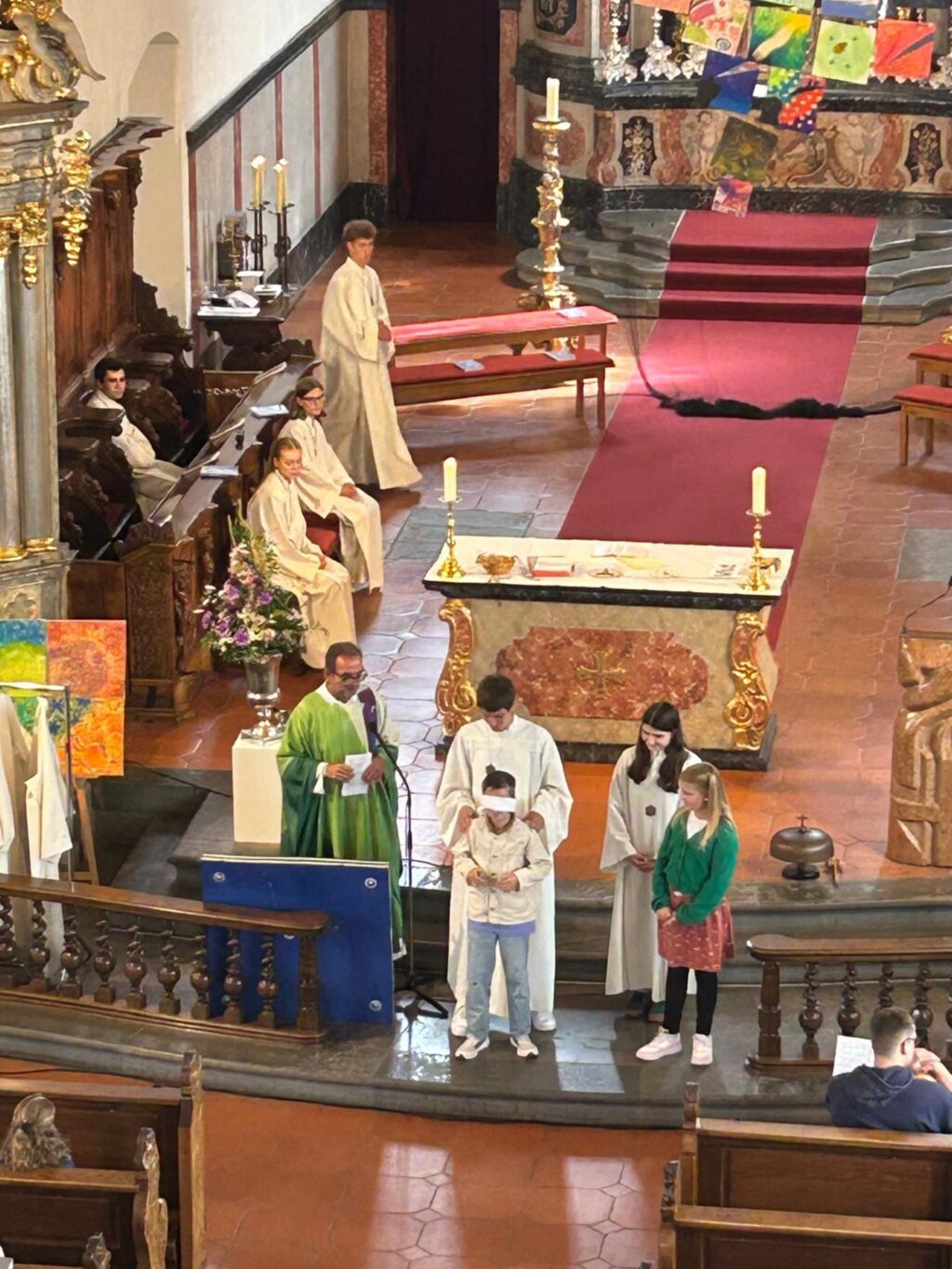 Ersatzweise fand die Ministrantenaufnahme in der Pfarrkirche St. Peter statt. Pfarrer Stefan Werner freute sich sehr darüber, dass nicht nur viele Jugendliche, sondern auch Erwachsene der Eucharistiefeier in der Kirche St. Peter beiwohnten. Diese wurde lebendig gestaltet von einer Chorgemeinschaft mit Instrumentalisten, Sängerinnen und Sängern, die am Schluss viel Beifall ernteten, wie auch die neuen und alten Minis und deren Leiterrunde. Deren Engagement lobte Pfarrer Stefan Werner ganz besonders.