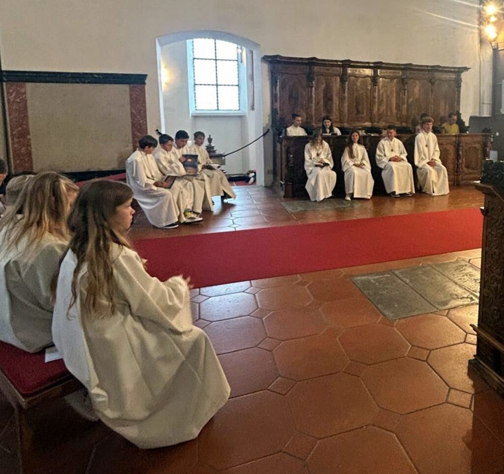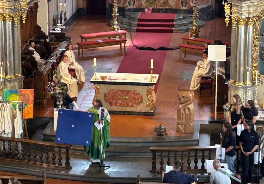An und für sich war geplant gewesen, dass die Aufnahme und Einkleidung der neuen Minis im Rahmen eines Gottesdienstes am Schlosssee in der Nähe des Ministrantenheims erfolgen sollte. Nur machte das Wetter nicht mit, so fielen dann auch die vorgesehenen Aktionen am Seeufer eben ganz ins Wasser.
