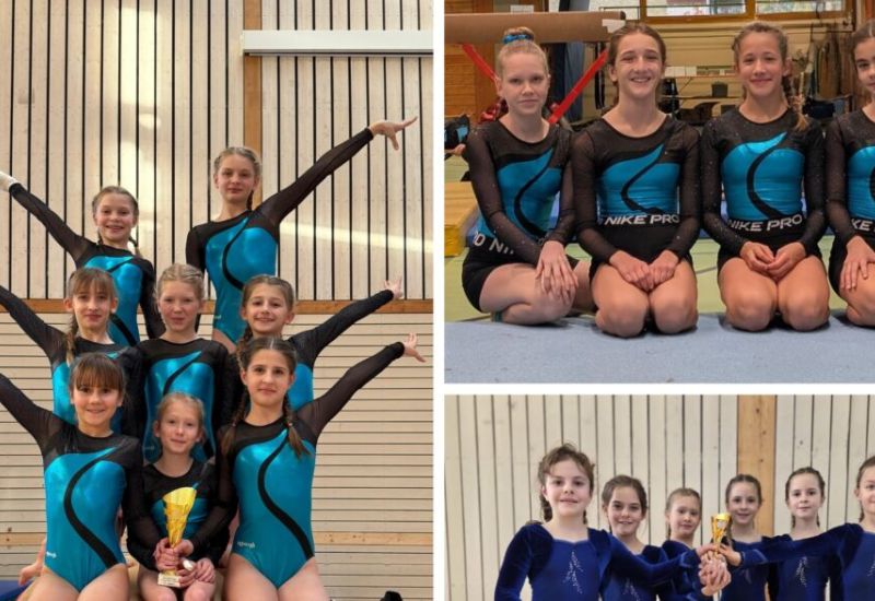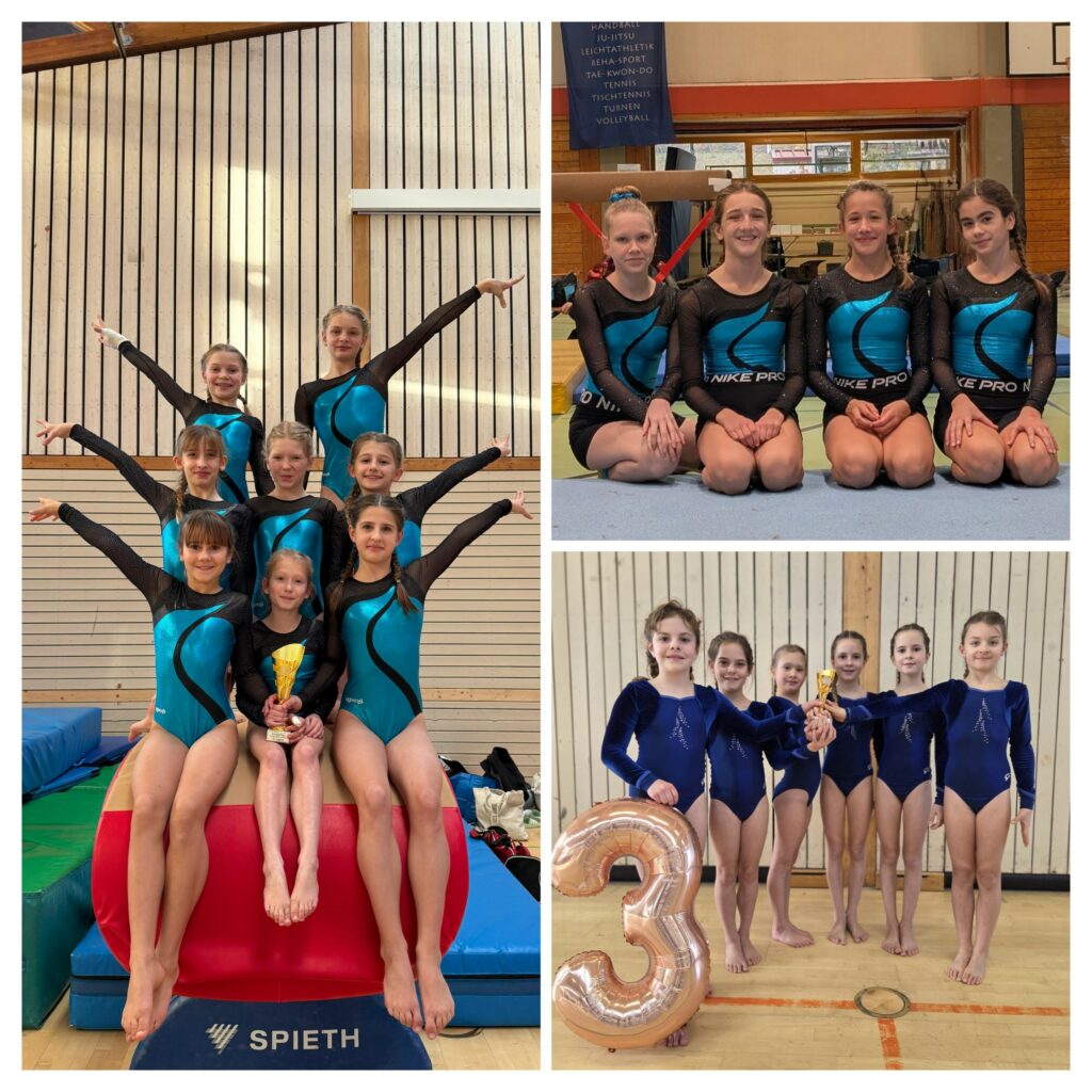 Die jüngsten Mädchen der E-Jugend (8/9 Jahre) konnten mit Karlotta Herdrich, Mia Erb, Romy Bixenmann, Madlen Bösch, Emely Bixenmann und Kalea Wespel an allen vier Geräten (Sprung, Reck, Balken und Boden) ihr Können unter Beweis stellen. In dem starken Teilnehmerfeld von 22 Mannschaften waren die Ergebnisse sehr knapp. Die Mädchen sicherten sich in Bad Wurzach den dritten und in Tettnang den sechsten Platz. Für den letzten Wettkampftag in Reute steigerte sich die Mannschaft vor allem am Sprung, weshalb sie im Tagesergebnis den dritten Platz erreichten. Somit landeten sie im Gesamtergebnis ebenfalls auf dem dritten Rang und nahmen strahlend den Pokal entgegen.