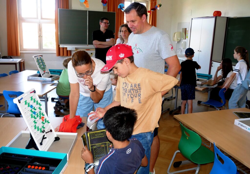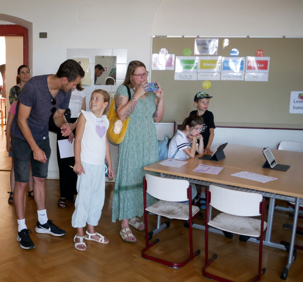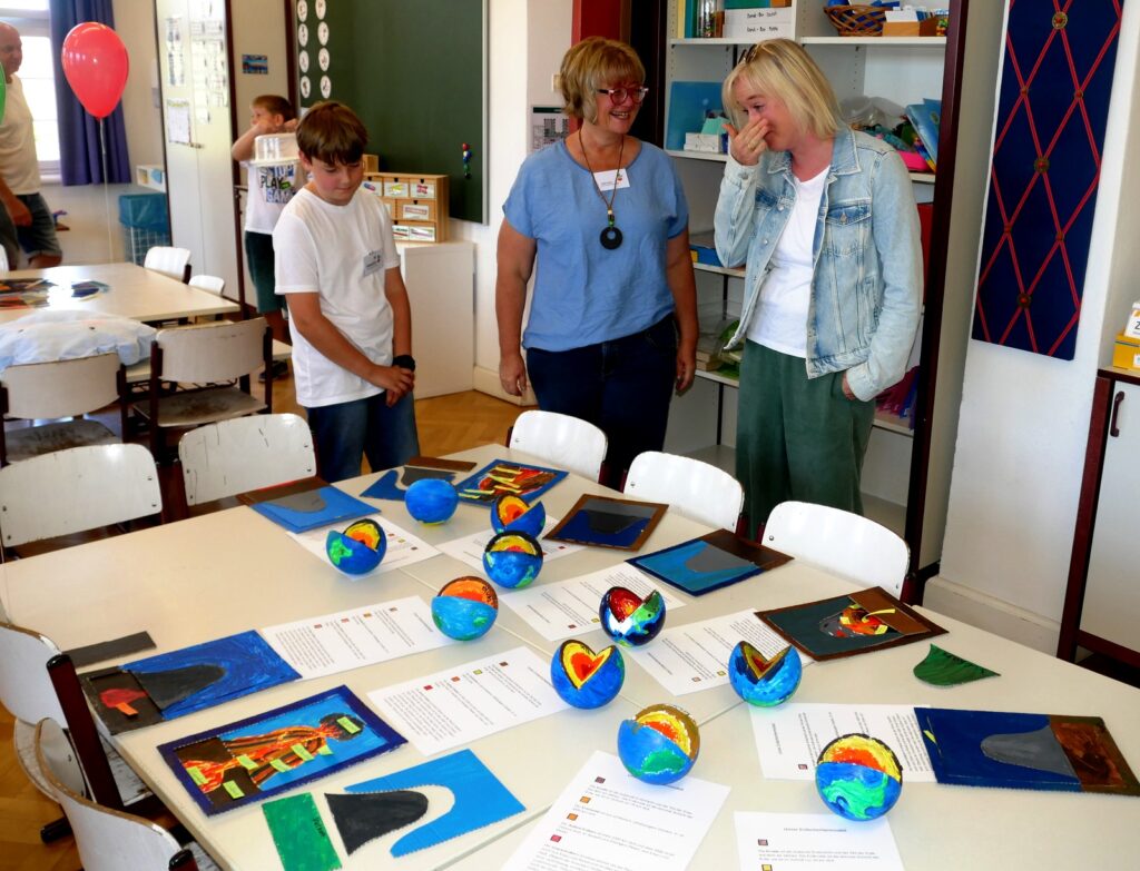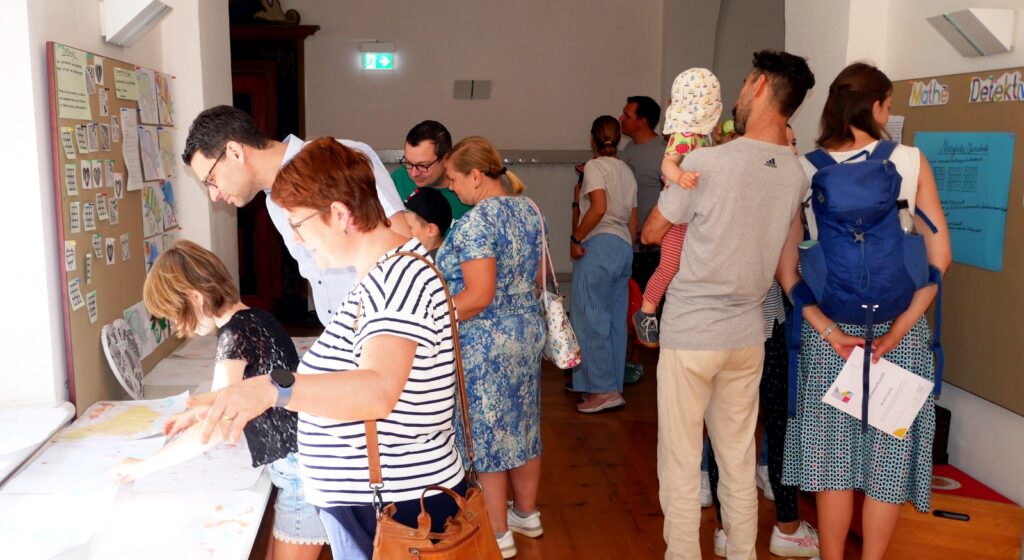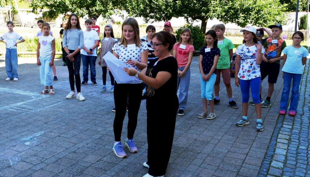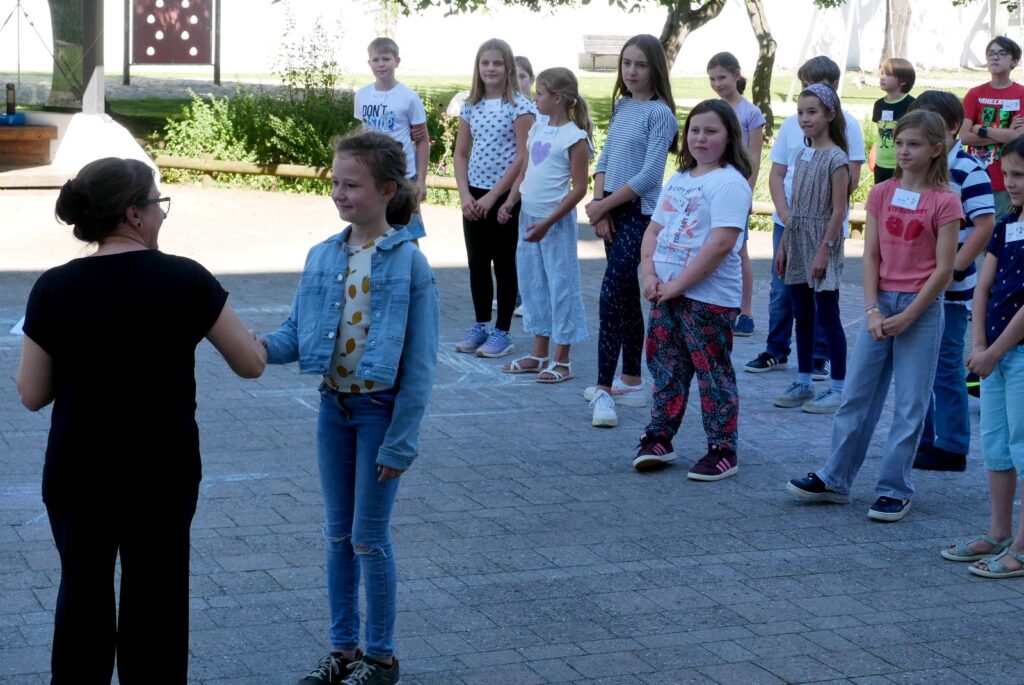 Die Förderprogramme hatten zum Ziel, dass hochbegabte Kinder sich mit anspruchsvollen Themen auseinandersetzen, neue Interessen entdecken und mit Gleichgesinnten lernen konnten. Das abwechslungsreiche Programm ermöglichte es, forschendes Lernen und kreative Herausforderungen und körperliche Aktivitäten zu verbinden. Kognitive und soziale Fähigkeiten wurden gestärkt. Davon konnten sich die Eltern, die am Freitag (8. August um 11.00 Uhr) zu einem „Gallery Walk“ eingeladen waren, voll überzeugen. Geli Zimmermann begrüßte die Eltern und Angehörigen der Kursteilnehmerinnen und Kursteilnehmer, die nach einem sportlich-rhythmischen Tanz vor dem Pausenpavillon viel Beifall ernteten.