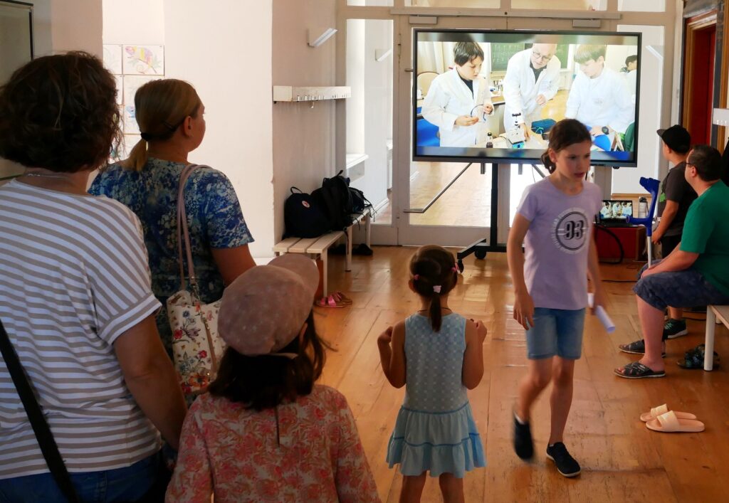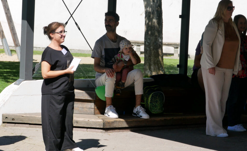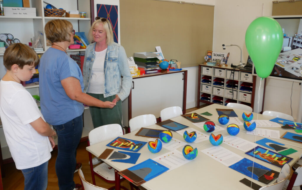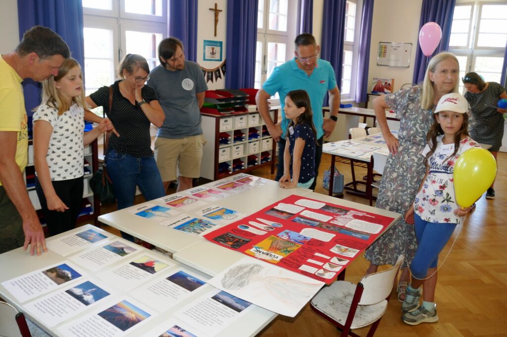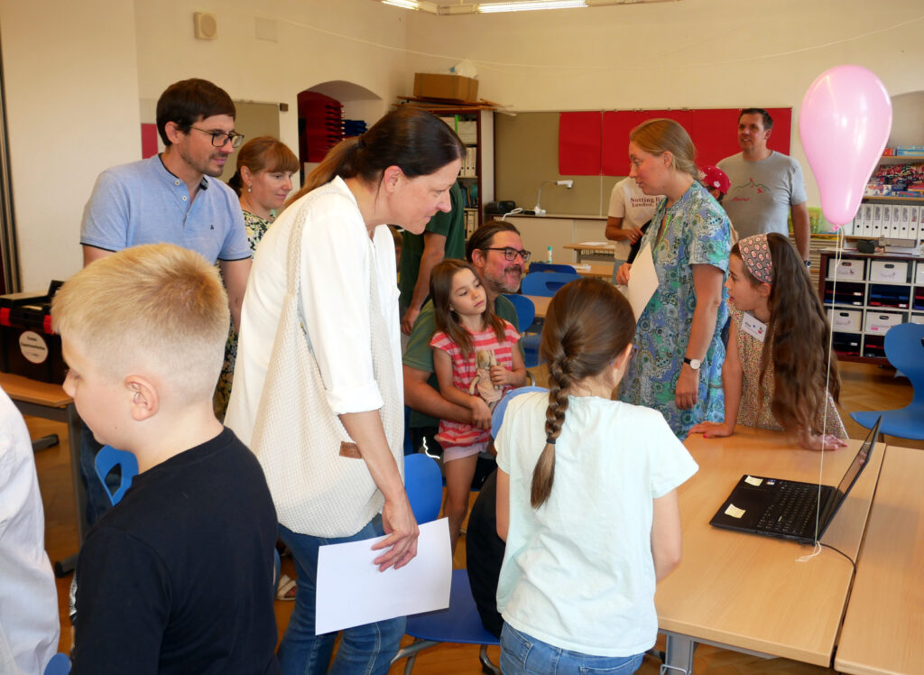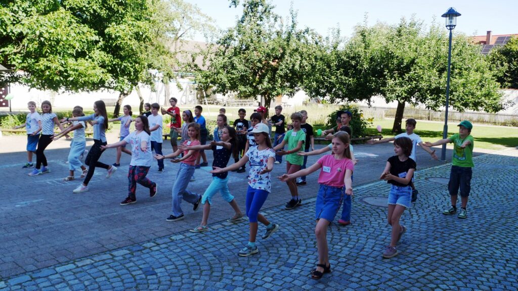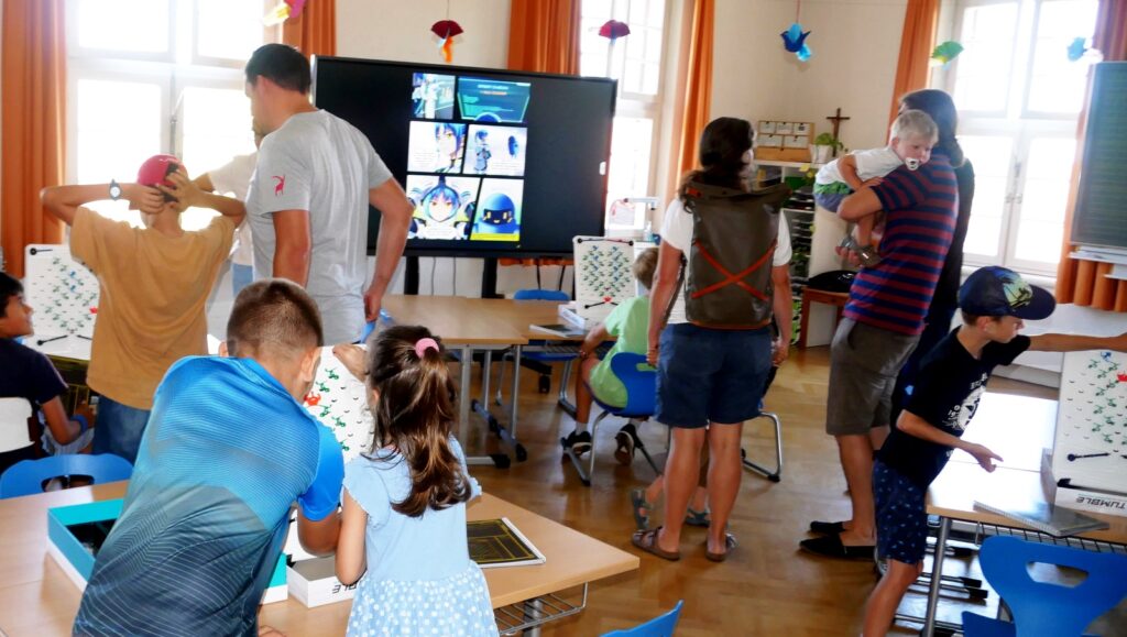 Die Förderprogramme hatten zum Ziel, dass hochbegabte Kinder sich mit anspruchsvollen Themen auseinandersetzen, neue Interessen entdecken und mit Gleichgesinnten lernen konnten. Das abwechslungsreiche Programm ermöglichte es, forschendes Lernen und kreative Herausforderungen und körperliche Aktivitäten zu verbinden. Kognitive und soziale Fähigkeiten wurden gestärkt. Davon konnten sich die Eltern, die am Freitag (8. August um 11.00 Uhr) zu einem „Gallery Walk“ eingeladen waren, voll überzeugen. Geli Zimmermann begrüßte die Eltern und Angehörigen der Kursteilnehmerinnen und Kursteilnehmer, die nach einem sportlich-rhythmischen Tanz vor dem Pausenpavillon viel Beifall ernteten.