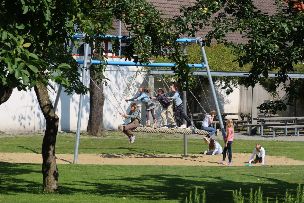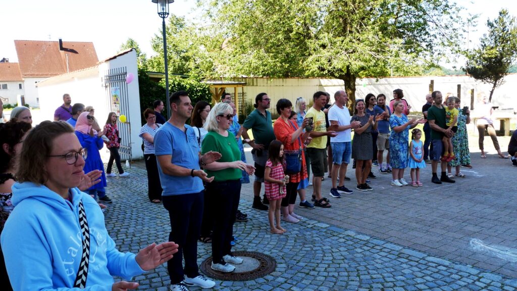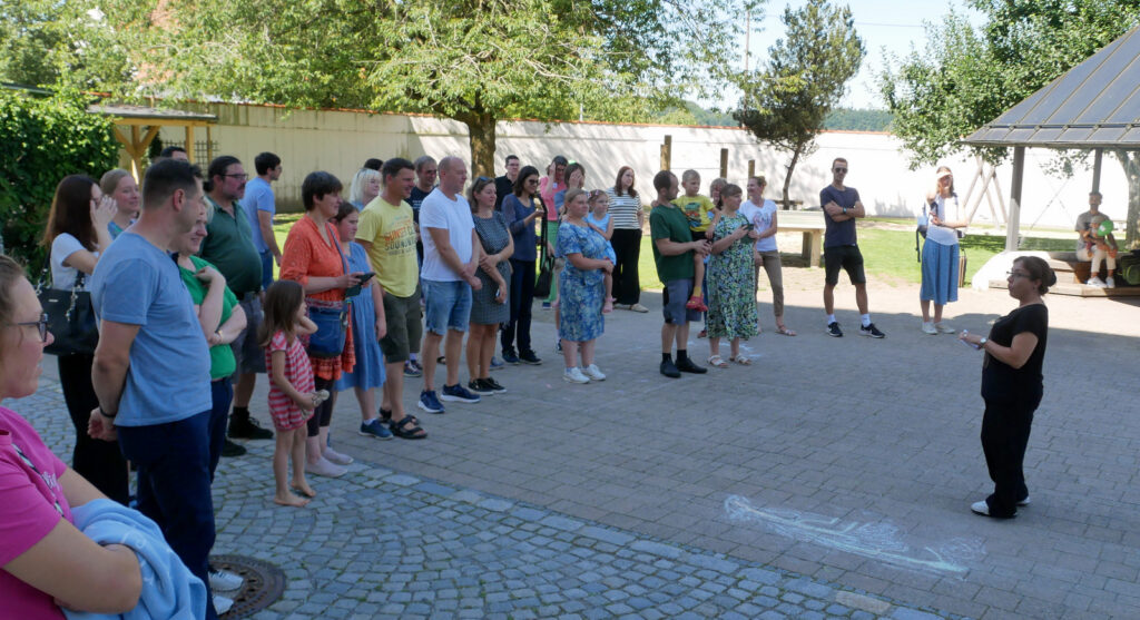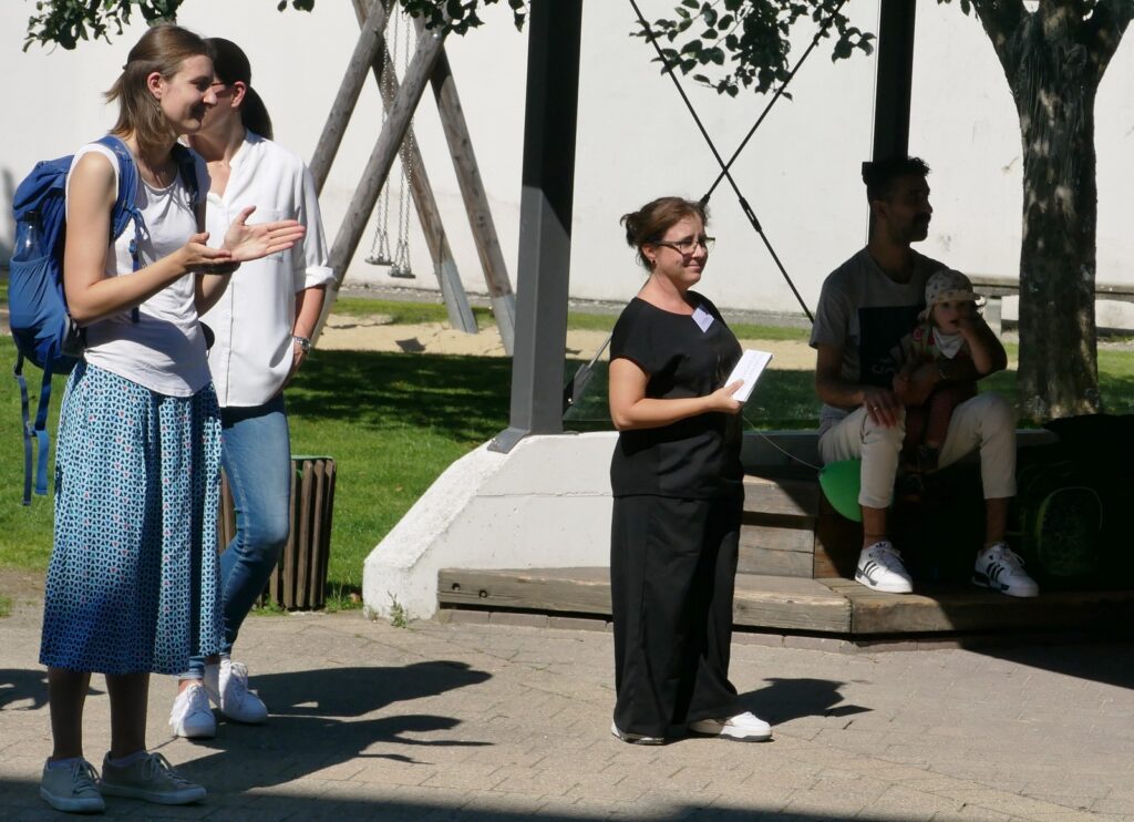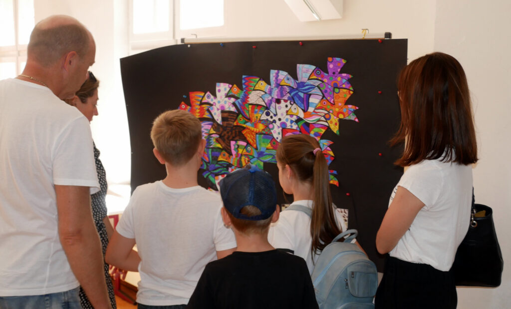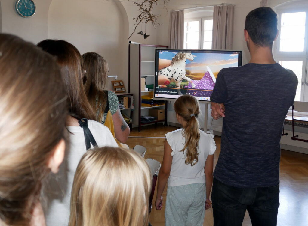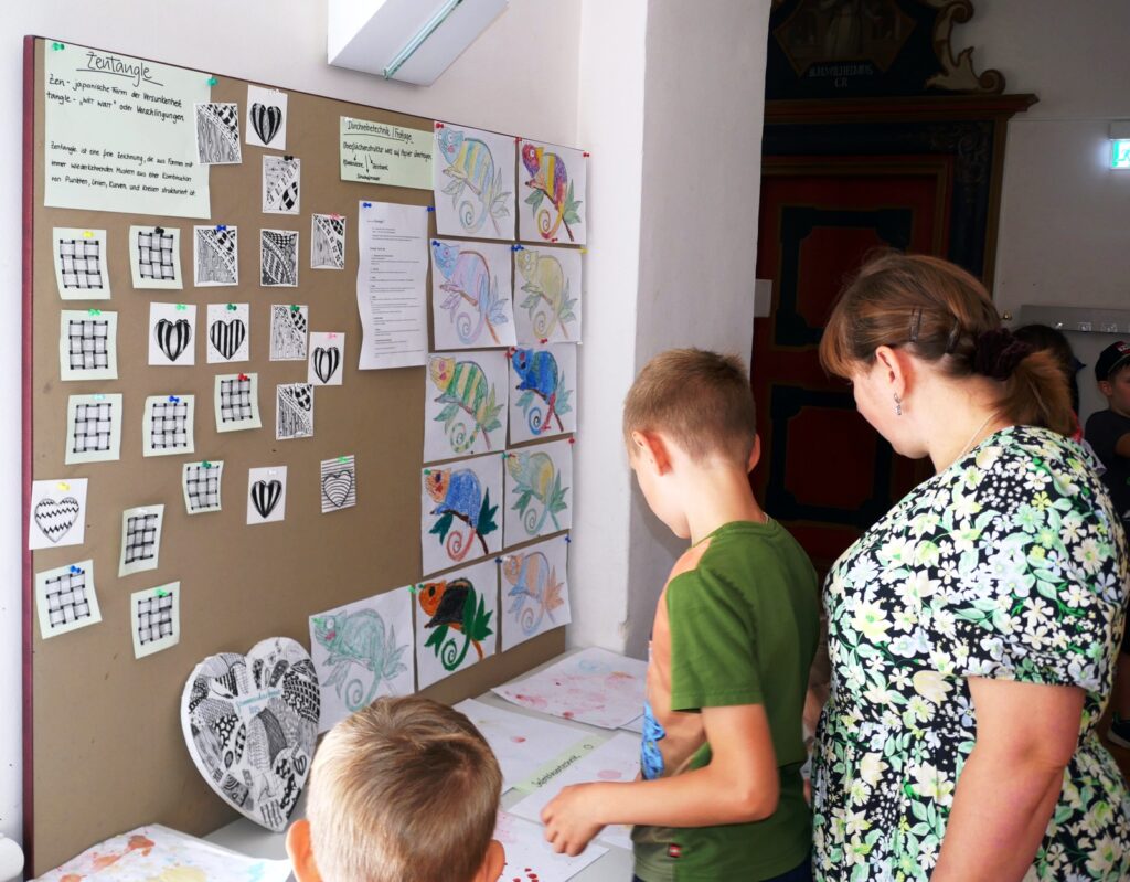 Die Förderprogramme hatten zum Ziel, dass hochbegabte Kinder sich mit anspruchsvollen Themen auseinandersetzen, neue Interessen entdecken und mit Gleichgesinnten lernen konnten. Das abwechslungsreiche Programm ermöglichte es, forschendes Lernen und kreative Herausforderungen und körperliche Aktivitäten zu verbinden. Kognitive und soziale Fähigkeiten wurden gestärkt. Davon konnten sich die Eltern, die am Freitag (8. August um 11.00 Uhr) zu einem „Gallery Walk“ eingeladen waren, voll überzeugen. Geli Zimmermann begrüßte die Eltern und Angehörigen der Kursteilnehmerinnen und Kursteilnehmer, die nach einem sportlich-rhythmischen Tanz vor dem Pausenpavillon viel Beifall ernteten.